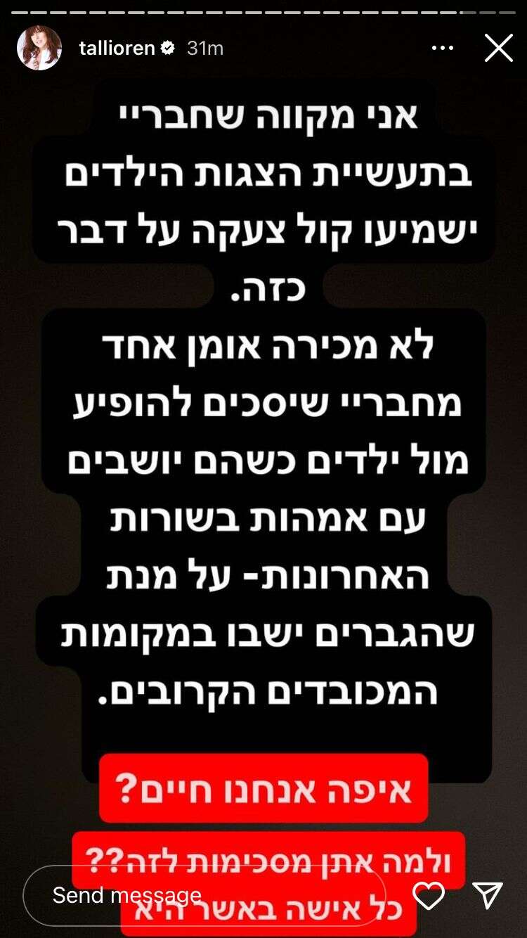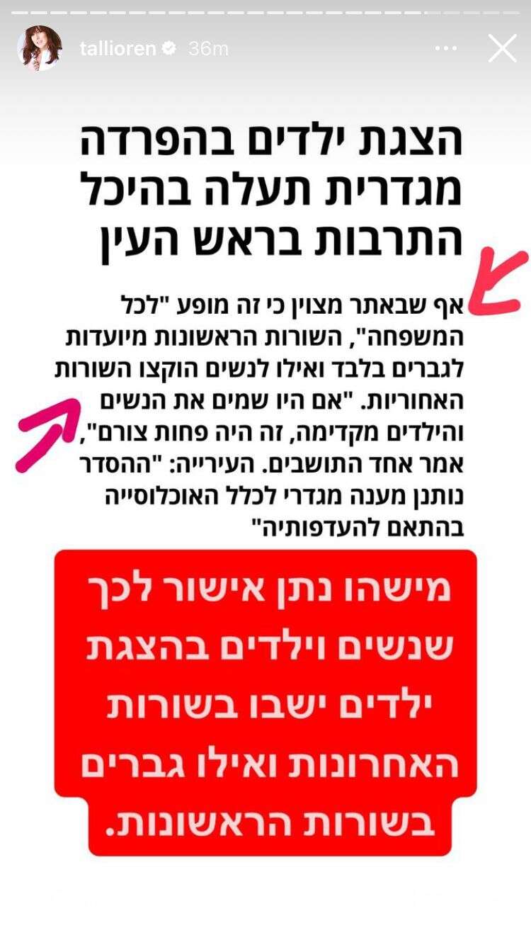 טלי אורן, שמרבה לשתף בחשבונה באינסטגרם בהתנגדותה הנחרצת לרפורמה המשפטית, שיתפה אמש (רביעי) את 30 אלף עוקביה בזעזועה העמוק מידיעה חדשותית שדיווחה על הפרדה מתוכננת בהצגת ילדים שעתידה להתקיים בהיכל התרבות בראש העין בשבוע הבא.