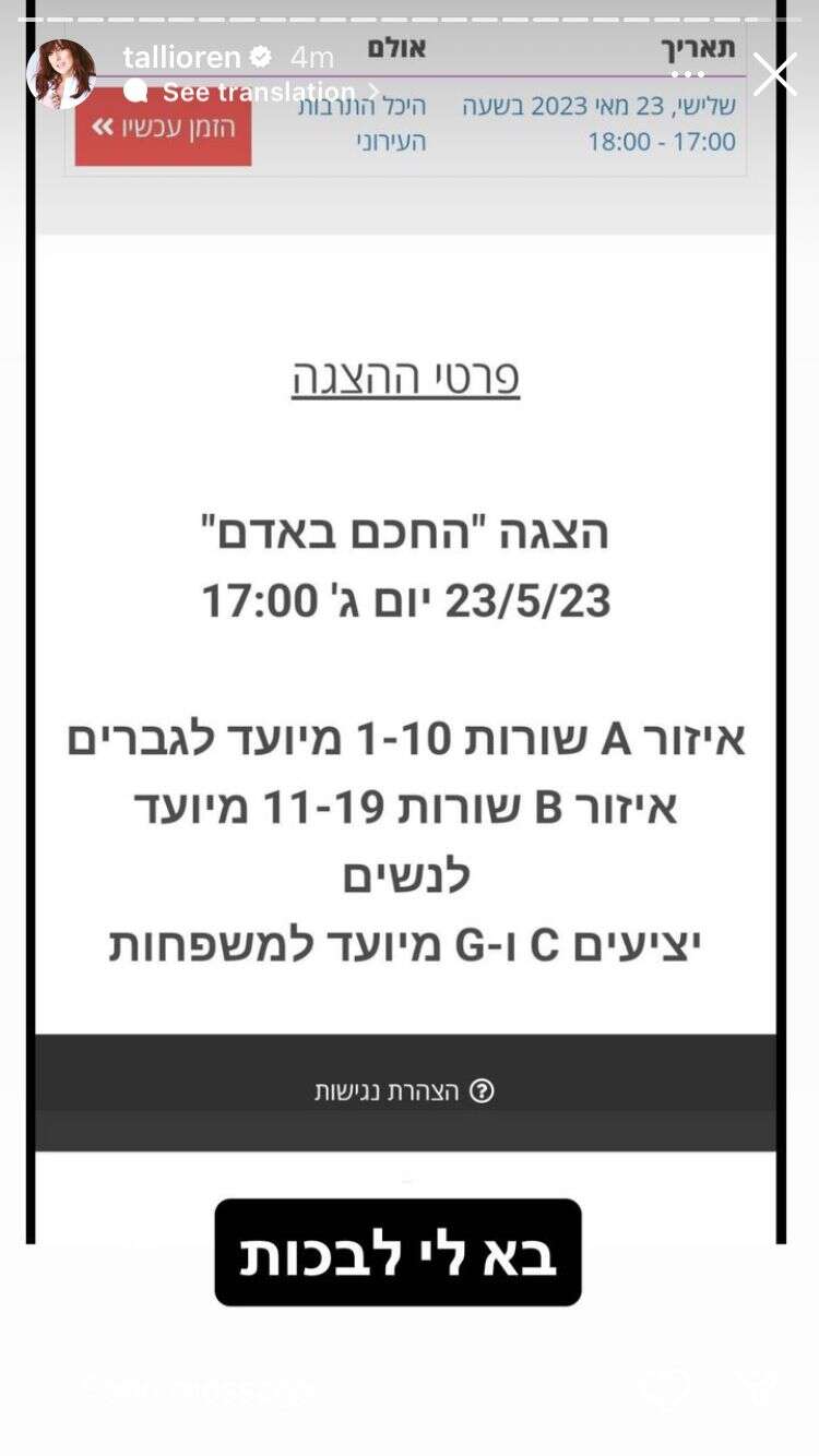 לאחר מכן הוסיפה צילום מסך של פרטי ההצגה שמוכיחים כי אכן ישנה כוונה להפריד בין המינים. "בא לי לבכות", הוסיפה בסערת רגשות. "כולי תקווה שהאולם יהיה ריק מנשים וילדים שלא יסכימו להגיע תחת השפלה כזו. ויותר מזה, הלוואי והגברים עצמם יתנגדו למהלך כזה וגם לא יגיעו", פיללה.