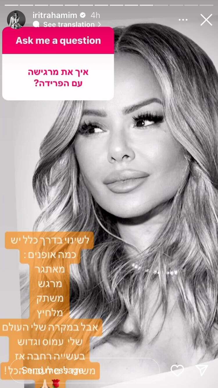 אירית רחמים החליטה אמש (שבת) לספק את יצר סקרנותם של 141 אלף עוקביה באינסטגרם ולענות באופן ישיר על שאלות שנשלחו אליה בנושא הפרידה הזוגית המתוקשרת שלה מבעליה של קבוצת הכדורגל הפועל ראשל"צ, עמוס לוזון. כזכור, השניים ניהלו זוגיות יציבה יחסית שנמשכה שמונה שנים.