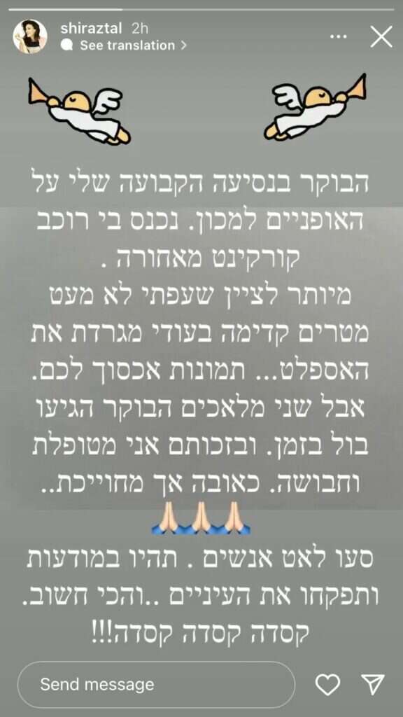 "הבוקר בנסיעה הקבועה שלי על האופניים למכון נכנס בי קורקינט מאחורה", כתבה טל בסטורי על רקע אפור וציור של שני מלאכים. "מיותר לציין שעפתי לא מעט מטרים קדימה, בעודי מגרדת את האספלט. תמונות שאחסוך מכם. אבל שני מלאכים הגיעו הבוקר בול בזמן, ובזכותם אני מטופלת וחבושה. כאובה אך מחויכת", עדכנה בטיפול המסור שהוענק לה על ידי צוות רפואי, שבסופו של דבר גרם לשיפור במצב רוחה.