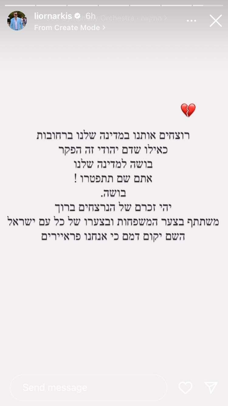 "רוצחים אותנו במדינה שלנו, ברחובות, כאילו שדם יהודי הוא הפקר. בושה למדינה שלנו. אתם שם, תתפטרו! בושה", תקף בכאב הזמר ליאור נרקיס. "כואב לי הלב ברמה שאי אפשר להסביר", שיתפה דנית גרינברג בתחושותיה הקשות. "אני לא מאמינה! ראש חודש. אלוהים, תיקח כבר את כל המחבלים האלה", כעסה פיינליסטית "האח הגדול" בר כהן. "ארבעה חברים הלכו לאכול חומוס במסעדה, נורו מטווח אפס ונרצחו. מה יהיה?", תהה מגיש הטלוויזיה נדב בורנשטיין.