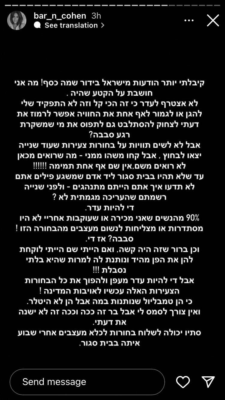 בר כהן ביקשה אמש (ראשון) להרגיע את הרוחות הסוערות ברשת וסירבה להצטרף למתקפות הקשות על דיירות "האח הגדול" שהגיעו אחרי שידור הסצנה הקשה בה הן תועדו מתעמרות כביכול בדיירת סתיו קצין, תוך שהן מונעות ממנה לייבש את שערה.