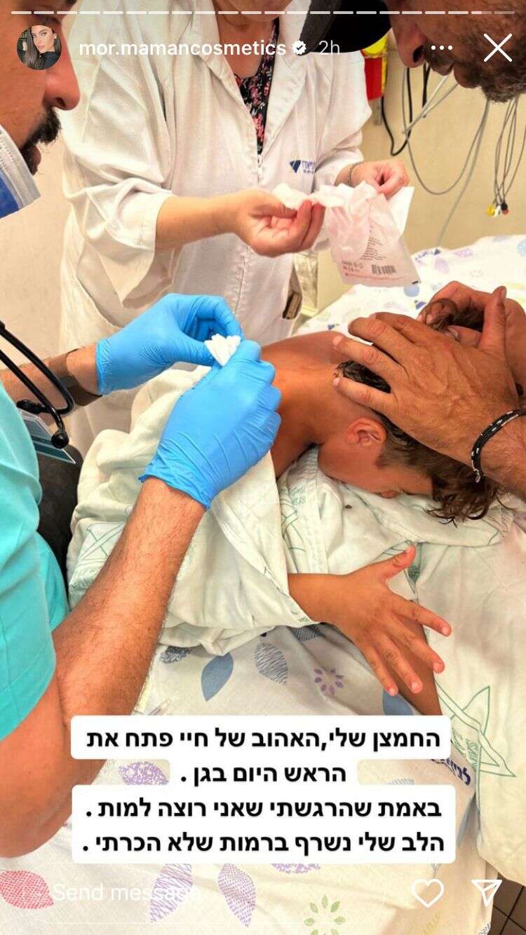 "החמצן שלי, האהוב של חיי, פתח את הראש היום בגן. באמת שהרגשתי שאני רוצה למות. הלב שלי נשרף ברמות שלא הכרתי", חלקה מור על רקע תמונה של בנה מטופל בבית החולים על ידי הצוות הרפואי.