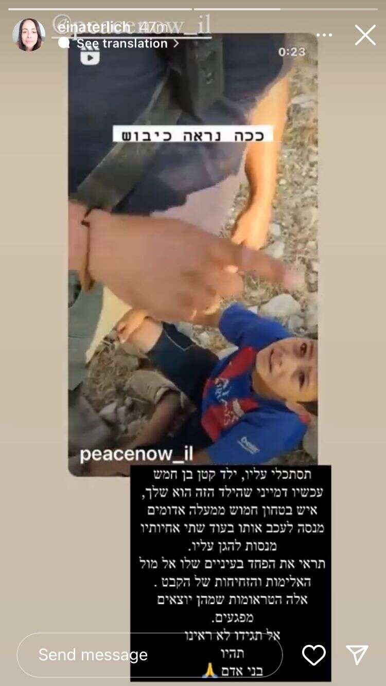 מגישת הטלוויזיה עינת ארליך פרסמה אתמול (שלישי) בסטורי בחשבונה באינסטגרם סרטון של תנועת "שלום עכשיו" שבו תועד ילד כשהוא מפוחד ומבוהל על רקע צווחות וקריאות "אתה משוגע" של קרובות משפחתו על קצין ביטחון שככל הנראה ולכאורה עיכב אותם בשטח. ארליך התקשתה להישאר אדישה נוכח המראות והקולות בסרטון ושיתפה את הגולשים בדעתה עליו.