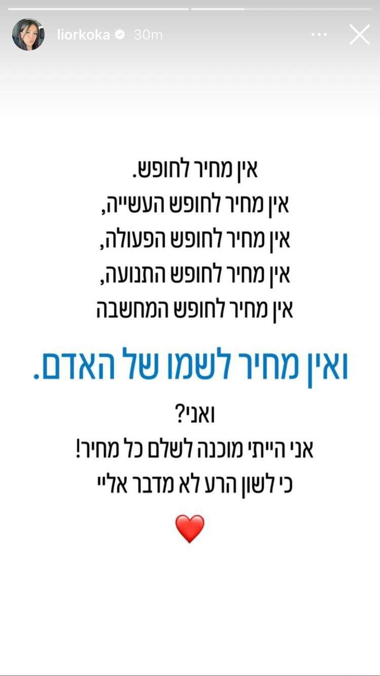בסטורי נוסף, קוקה הסבירה את הלך החשיבה שלה והגישה שבה היא מקפידה לנקוט, גם בשעה קשה של הפסד צורם: "אין מחיר לחופש. אין מחיר לחופש העשייה, אין מחיר לחופש הפעולה, אין מחיר לחופש התנועה, אין מחיר לחופש המחשבה ואין מחיר לשמו של אדם", הבהירה. "ואני? אני הייתי מוכנה לשלם כל מחיר! כי לשון הרע לא מדבר אליי", סיכמה וצירפה אימוג'י של לב אדום.