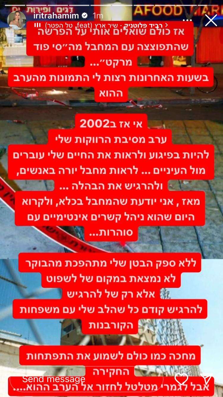 "אז כולם שואלים אותי על הפרשה שהתפוצצה עם המחבל מה'סי פוד מרקט'", כתבה רחמים. "בשעות האחרונות רצות לי התמונות מהערב ההוא. אז, ב-2002, ערב מסיבת הרווקות שלי, להיות בפיגוע ולראות את החיים שלי עוברים מול העיניים. לראות מחבל יורה באנשים ולהרגיש את הבהלה. מאז אני יודעת שהמחבל בכלא, ולקרוא היום שהוא ניהל קשרים אינטימיים עם סוהרות.