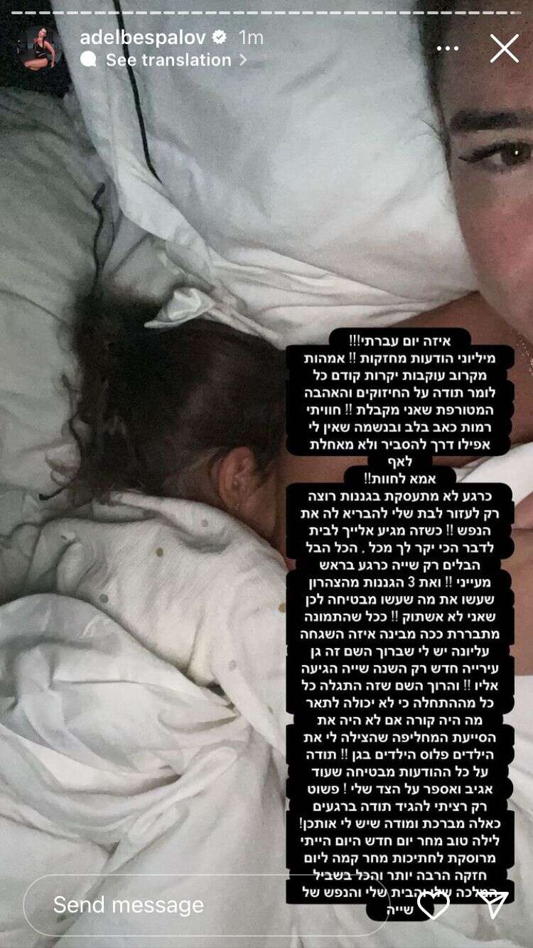 "איזה יום עברתי! מיליוני הודעות מחזקות! אימהות, עוקבות יקרות, קודם כל תודה על החיזוקים והאהבה המטורפת שאני מקבלת! חוויתי רמות כאב בלב ובנשמה שאין לי אפילו דרך להסביר, ולא מאחלת לאף אימא לחוות!", כתבה בספלוב הנסערת.