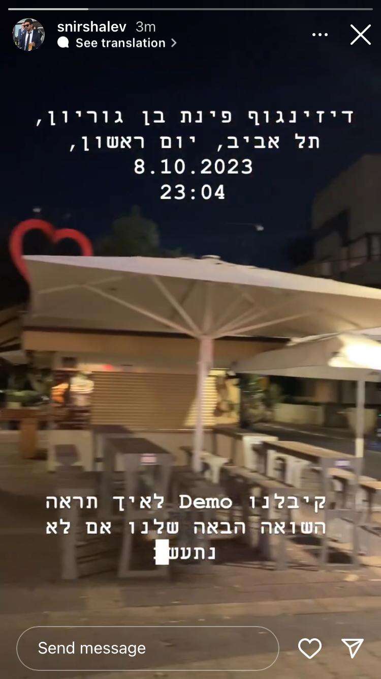 "דיזנגוף פינת בן גוריון. תל אביב, יום ראשון, 8 באוקטובר 2023, 23:04. קיבלנו 'דמו' לאיך תראה השואה הבאה שלנו אם לא נתעשת", הזהיר שלו על רקע סרטון שבו הציג את רחובותיה המפורסמים של תל אביב, שבדרך כלל שוקקי חיים ומלאים בבליינים, שכעת שרויים בדממה כמעט מוחלטת.
