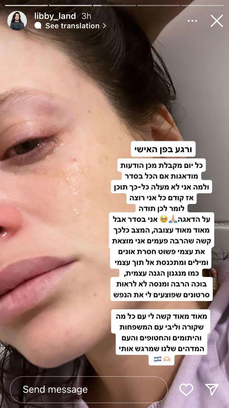 ליבי נחימובסקי (ליבילנד) פתחה אתמול (שלישי) את הלב וסיפרה על הימים הקשים והמורכבים שעוברים עליה מאז חדר ארגון הטרור חמאס אל יישובי ישראל וביצע טבח נוראי. באומץ היא סיפרה על הקושי שלה להתגייס ולתרום למאמץ הלאומי בשעתה הקשה של המדינה.