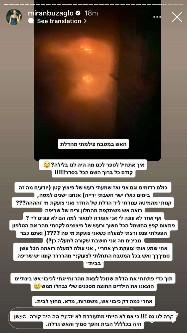 בצל ימים לא פשוטים שעוברים על המדינה כולה, הזוג מירן ומאור בוזגלו נאלצו להתמודד אמש (שני) עם דרמה מלחיצה ומבהילה במיוחד כשבזמן שישנו פרצה שריפה משמעותית וגדולה בביתם שסיכנה את חייהם וחיי ילדיהם. הבוקר היא שיתפה את עוקביה בהשתלשלות האירועים המצמררת.