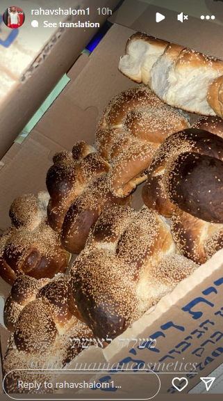 "משלוח לאשתי", שיתף רהב משולם בסטורי שהעלה לאינסטגרם עם תמונה של חלות מבני ברק ובו מתוייגת ממן.