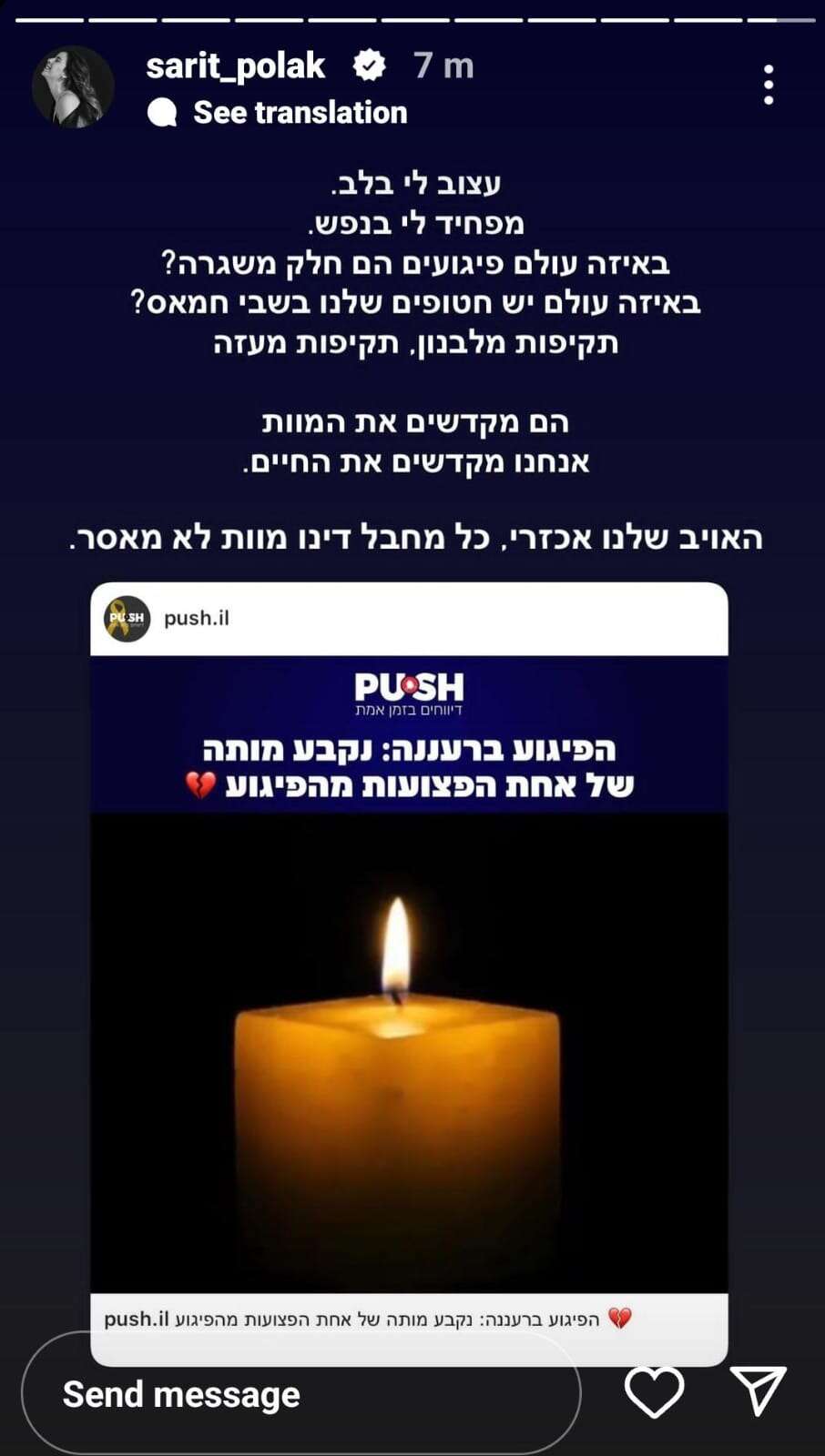 "עצוב לי בלב, מפחיד לי בנפש", שיתפה שרית פולק בתחושותיה. "באיזה עולם פיגועים הם חלק משגרה? באיזה עולם יש חטופים שלנו בשבי חמאס? תקיפות מלבנון, תקיפות מעזה. הם מקדשים את המוות, אנחנו מקדשים את החיים. האויב שלנו אכזרי, כל מחבל דינו מוות – לא מאסר".