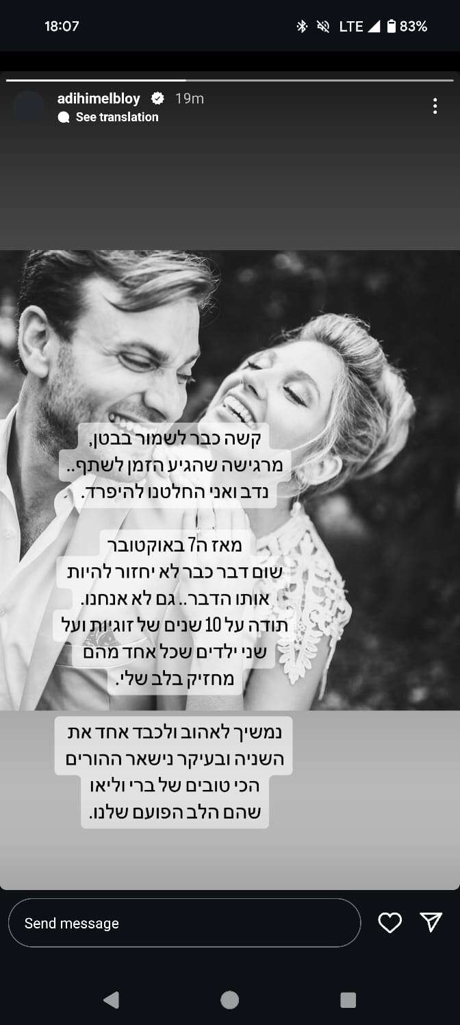 "נמשיך לאהוב ולכבד אחד את השנייה ובעיקר נישאר ההורים הכי טובים של ברי וליאו שהם הלב הפועם שלנו".
