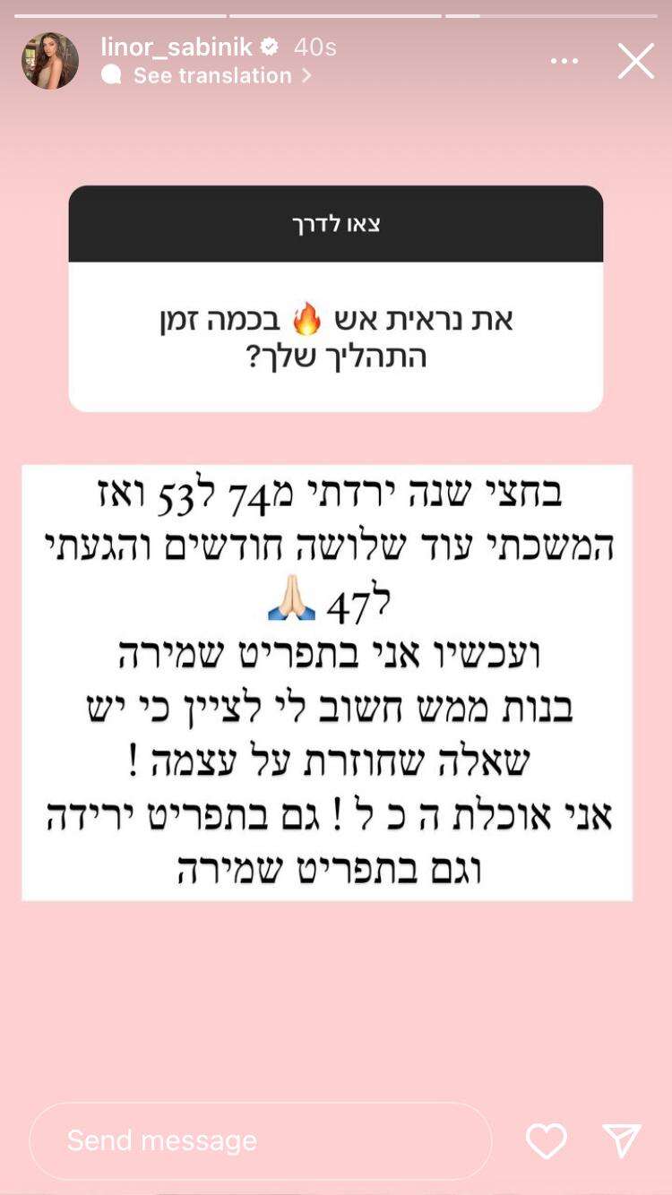 "את נראית אש, כמה זמן ארך התהליך שלך?", ביקשו לדעת. "בחצי שנה ירדתי מ-74 (קילוגרם) ל-53, ואז המשכתי עוד שלושה חודשים והגעתי ל-47", סיפרה כוכבת "האח הגדול". "עכשיו אני בתפריט שמירה. בנות, ממש חשוב לציין כי יש שאלה שחוזרת על עצמה: אני אוכלת הכל! גם בתפריט הירידה וגם בתפריט השמירה".