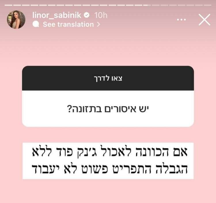 "אפשר לאכול במסעדות בחוץ?", התעניינו. "אפשר לאכול בחוץ במסעדות, אבל בתור התחלה ניסיתי כמה שפחות כי רציתי להגיע לתוצאות מהירות יותר", הסבירה. "יש איסורים בתזונה?", נשאלה סביניק. "אם הכוונה היא לאכול ג'אנק פוד ללא הגבלה, התפריט פשוט לא יעבוד", סיכמה.