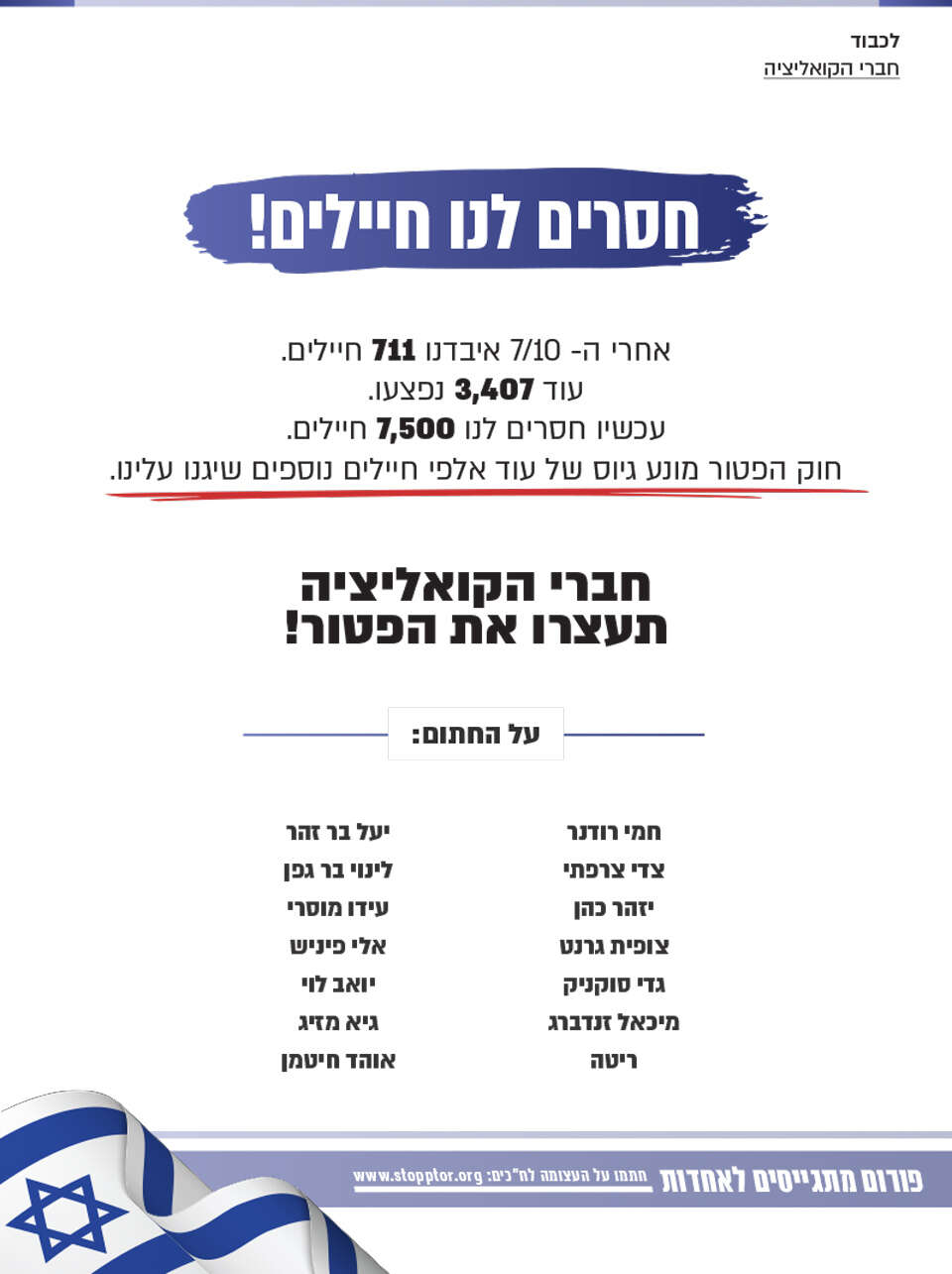 במכתב שנשלח לחברי הקואליציה נכתב: "חסרים לנו חיילים! אחרי 7 באוקטובר איבדנו 711 חיילים, עוד 3,407 נפצעו", לשון המכתב. "עכשיו חסרים לנו 7,500 חיילים. חוק הפטור מונע גיוס של עוד אלפי חיילים נוספים שיגנו עלינו. תעצרו את הפטור".