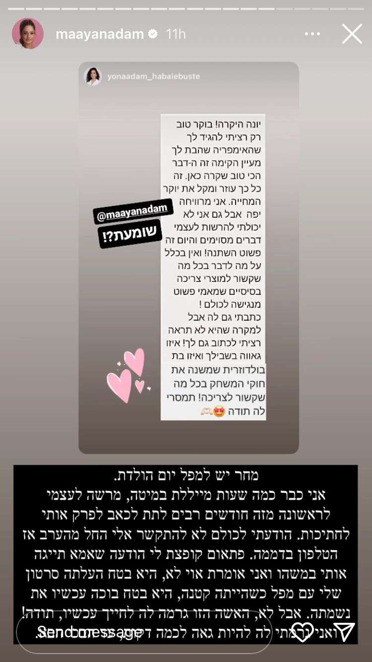 "אני כבר כמה שעות מייללת במיטה": הסטורי של מעיין אדם // אינסטגרם