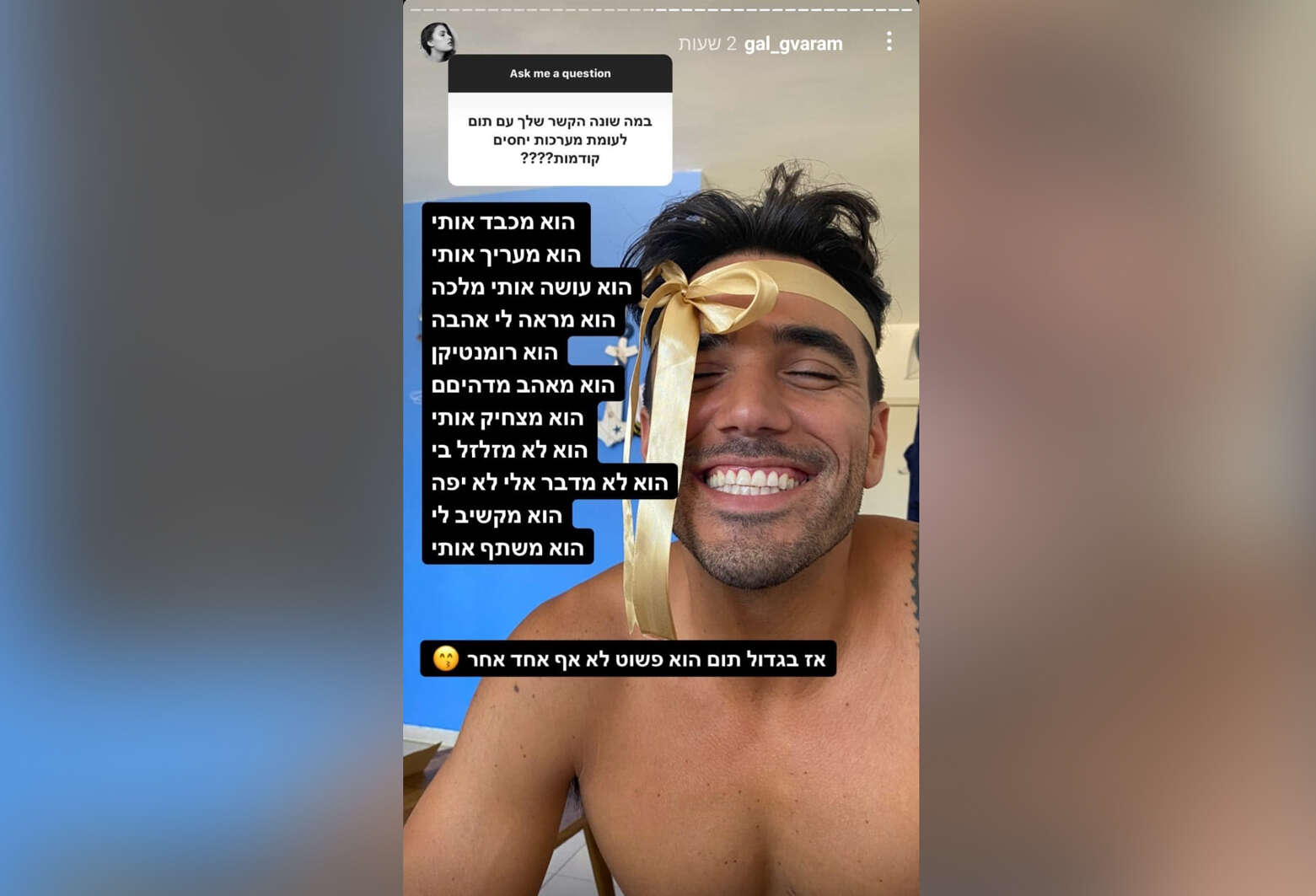 כך למשל גל גברעם, שערכה אתמול (שלישי) מפגש שאלות ותשובות עם עוקביה, שרבים מהם דרשו בין היתר לדעת איך היא ידעה שהיא מאוהבת בבן זוגה, תום חיימוב, אותו הכירה בבית.