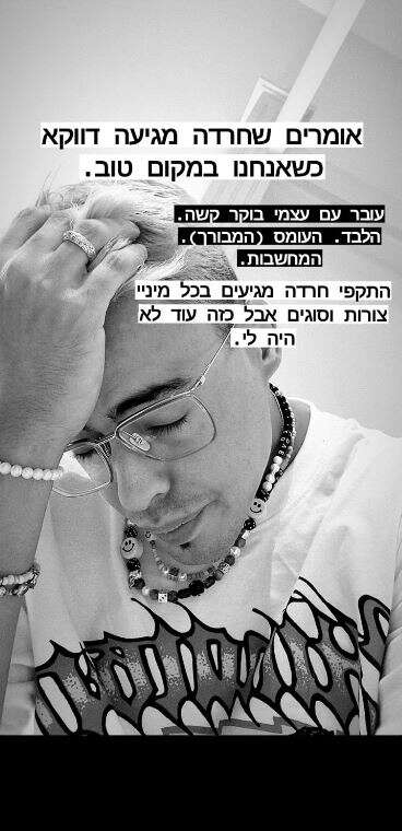 ״אומרים שחרדה מגיעה דווקא כשאנחנו במקום טוב. עובר עם עצמי בוקר קשה. הלבד, העומס (המבורך) והמחשבות״, הוא החל את הפוסט. ״התקפי חרדה מגיעים בכל מיני צורות וסוגים אבל כזה עוד לא היה לי״, שיתף באומץ.