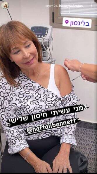 נחמיאס הגיעה השבוע לבית החולים בלינסון, שם קיבלה את מנת החיסון השלישית. היא אפילו טרחה לתייג את ראש הממשלה בנט וכתבה: "גם אני עשיתי חיסון שלישי". בנט מצדו לא נשאר אדיש לתיוג. הוא שיתף את התמונה של נחמיאס בעמוד האינסטגרם שלו, כתב "גם חני נחמיאס התחסנה" וליווה הכל בקריאה המתבקשת לעידוד אנשים בגילאים הרלוונטיים לצאת ולהתחסן.