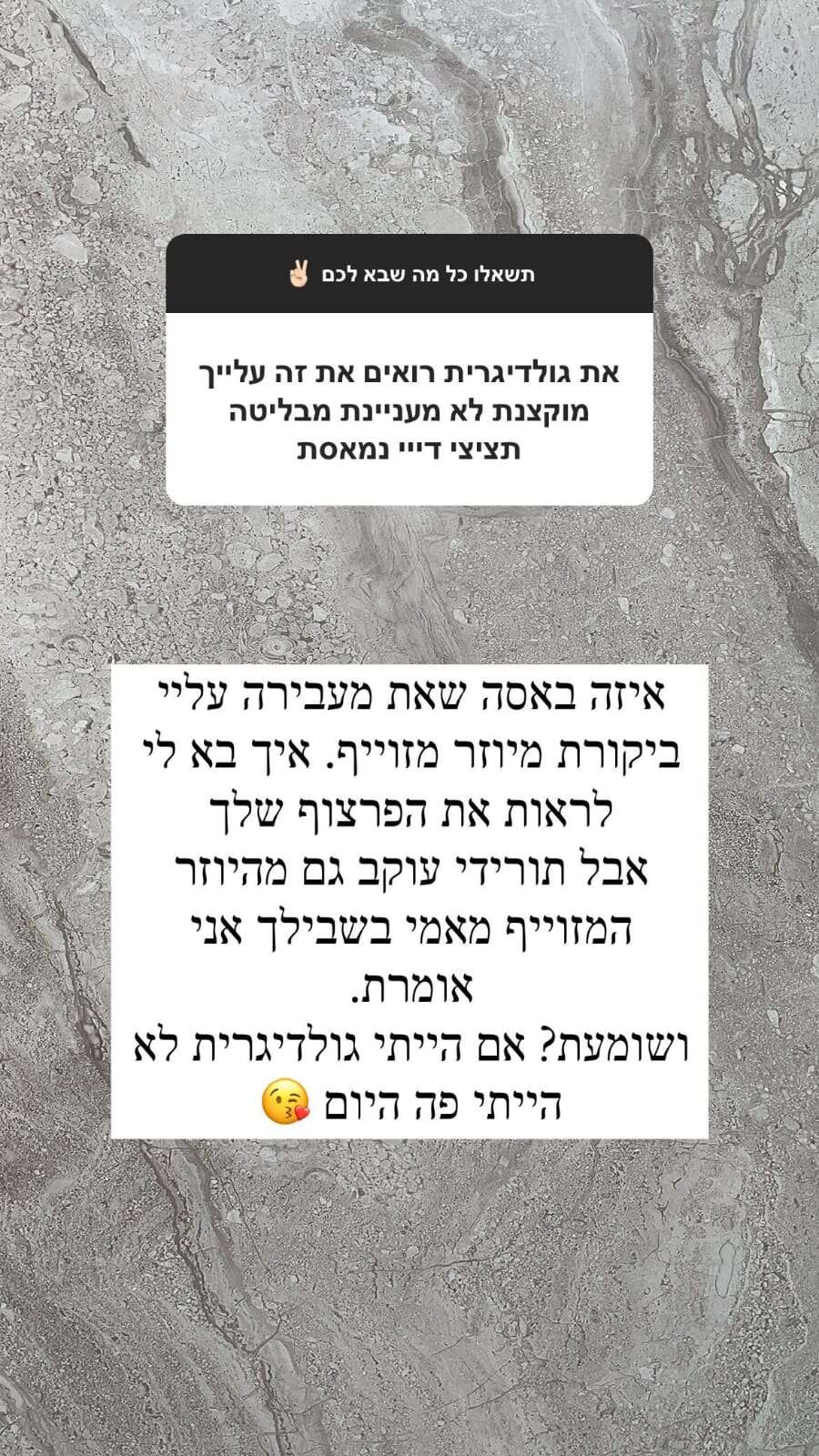 לגולשת אחרת, שכינתה אותה גולד דיגרית, אשכנזי דווקא בחרה להגיב באופן רגוע למדי והזמינה אותה להסיר ממנה עוקב, תוך שהיא מוסיפה בציניות שחבל שהגיבה מיוזר מזויף כי הייתה רוצה לראות את פרצופה, וכי אם באמת היא הייתה גולד דיגרית, לא הייתה מגיעה לאן שהיא נמצאת היום.