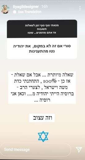 "התחתנתי כדת משה וישראל", ציינה והוסיפה: "לצערי הרב ברוסיה הייתי יהודייה מ... וכאן אני רוסיה מ... וזה עצוב", כשהיא חותמת את צילום המסך בציור של מגן דוד.