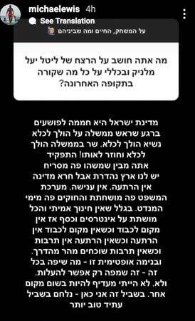 מייקל לואיס מעולם לא הסתיר את דעותיו הנחרצות ולעתים המאוד לא פופולריות או קלות לעיכול בכל הנוגע למצב במדינה והאופן בו העומדים בראשה בוחרים לנהלה. לא פעם הוא גם משתף את מאות אלפי עוקביו ברשתות החברתיות בפוסטים ביקורתיים המעוררים סערה. במסגרת סשן שאלות ותשובות שערך היום (חמישי) הכוכב, הוא נשאל מה הוא חושב על הרצח של ליטל יעל מלניק ז"ל ובאופן כללי מהי דעתו על כל מה שקורה בתקופה האחרונה, והוא לא חסך בביקורת קשה נגד המדינה והעומדים בראשה.