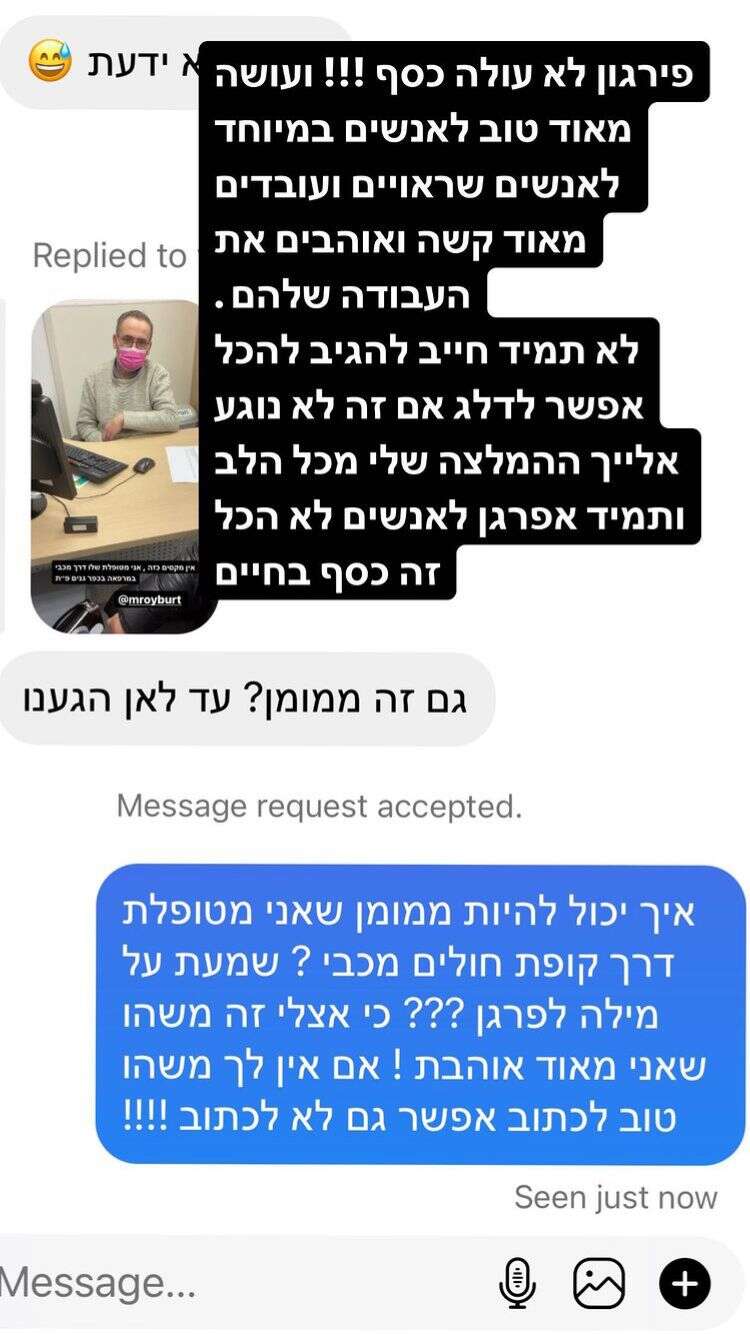 בעוד בוזגלו האמינה שהיא עושה מעשה טוב ומקדמת איש מקצוע מהימן, גולשת סרקסטית ונרגזת שלחה לה הודעה שבה כתבה לה בציניות "גם זה ממומן? לאן הגענו". בוזגלו נעלבה וזעמה על כך שהגולשת תקפה אותה, ושיתפה צילומי מסך בהם הסבירה כי אין שום דבר ממומן בפוסט וכי היא מטופלת דרך קופת חולים מכבי בדיוק כמו כל מטופלת "רגילה".