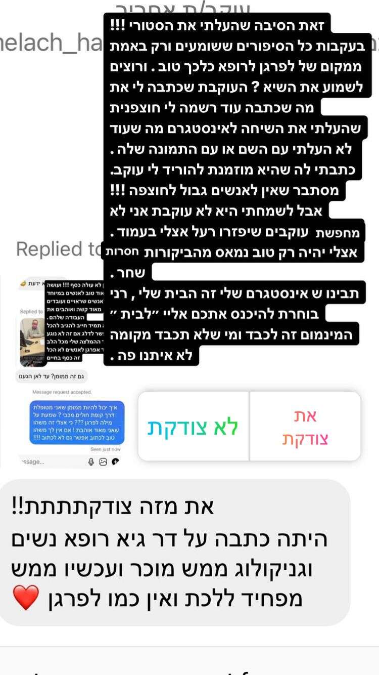 בסטורי שהעלתה בוזגלו תיעדה את עצמה יושבת במרפאתו של רופא הנשים שלה, לאחר שסיימה בדיקה שגרתית חודש לאחר הלידה. לאחר שעדכנה כי הכל תקין, בוזגלו פרגנה בחום לרופא ואף ביקשה ממנו להציג את עצמו ולספר על השירותים שהוא נותן, כשהיא מדגישה כמה חשוב לה לפרגן לו לנוכח כל השיח הקשה והטעון שיש בחודשים האחרונים בנוגע לרופאי נשים והטרדות מיניות.