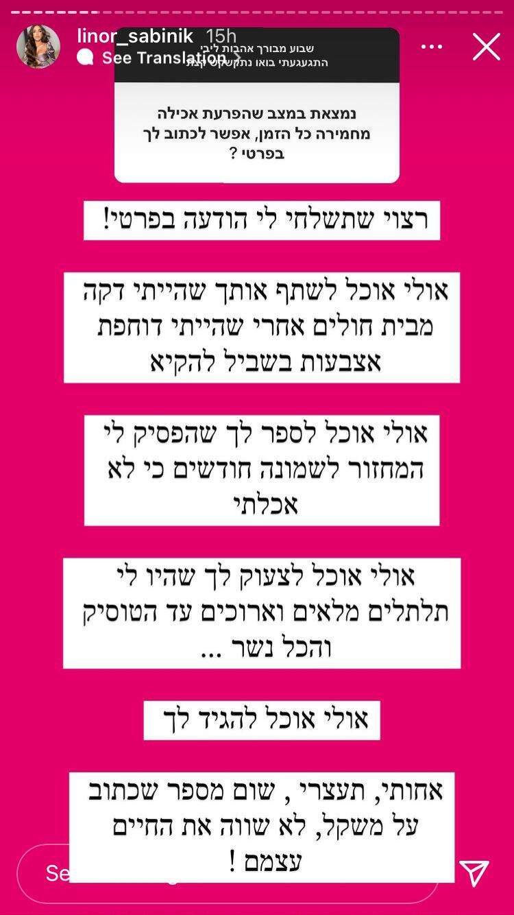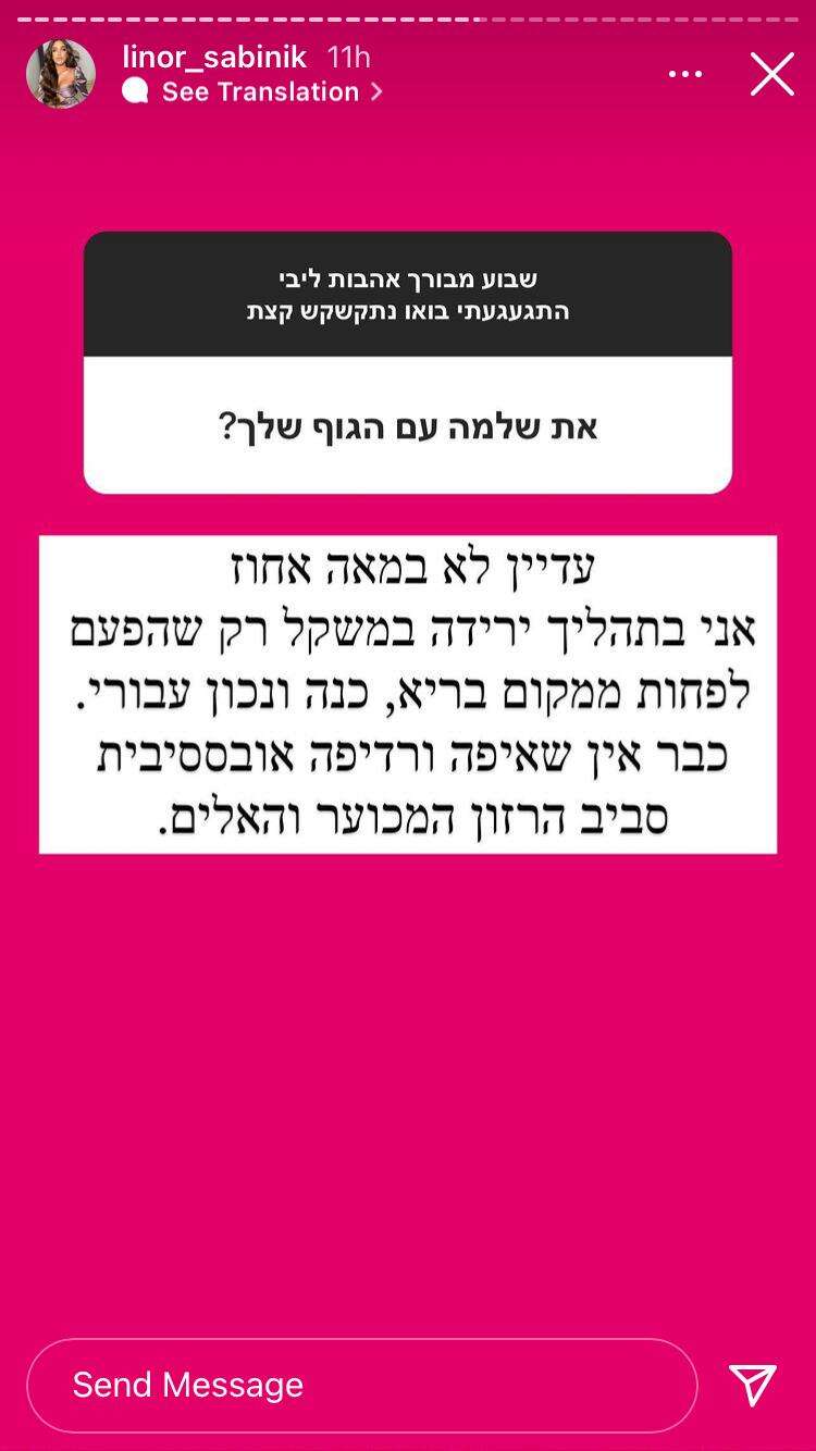 "שבוע מבורך, אהבות ליבי" כתבה סביניק לעוקבות. "התגעגעתי, בואו נקשקש קצת". אחת השאלות הראשונות שעליהן השיבה סביניק הייתה של אחת העוקבות ששיתפה בהפרעות האכילה שאיתן היא מתמודדת וביקשה עזרה בנושא. "רצוי שתשלחי לי הודעה בפרטי!", כתבה לה לינור. "אולי אוכל לשתף אותך שהייתי דקה מבית חולים אחרי שדחפתי אצבעות בשביל להקיא. אולי אוכל אספר לך שהפסיק לי המחזור שמונה חודשים כי לא אכלתי. אולי אוכל לצעוק לך שהיו לי תלתלים עד הטוסיק והכל נשר", שיתפה באומץ. "אחותי, תעצרי. שום מספר על המשקל לא שווה את החיים עצמם", סיכמה.