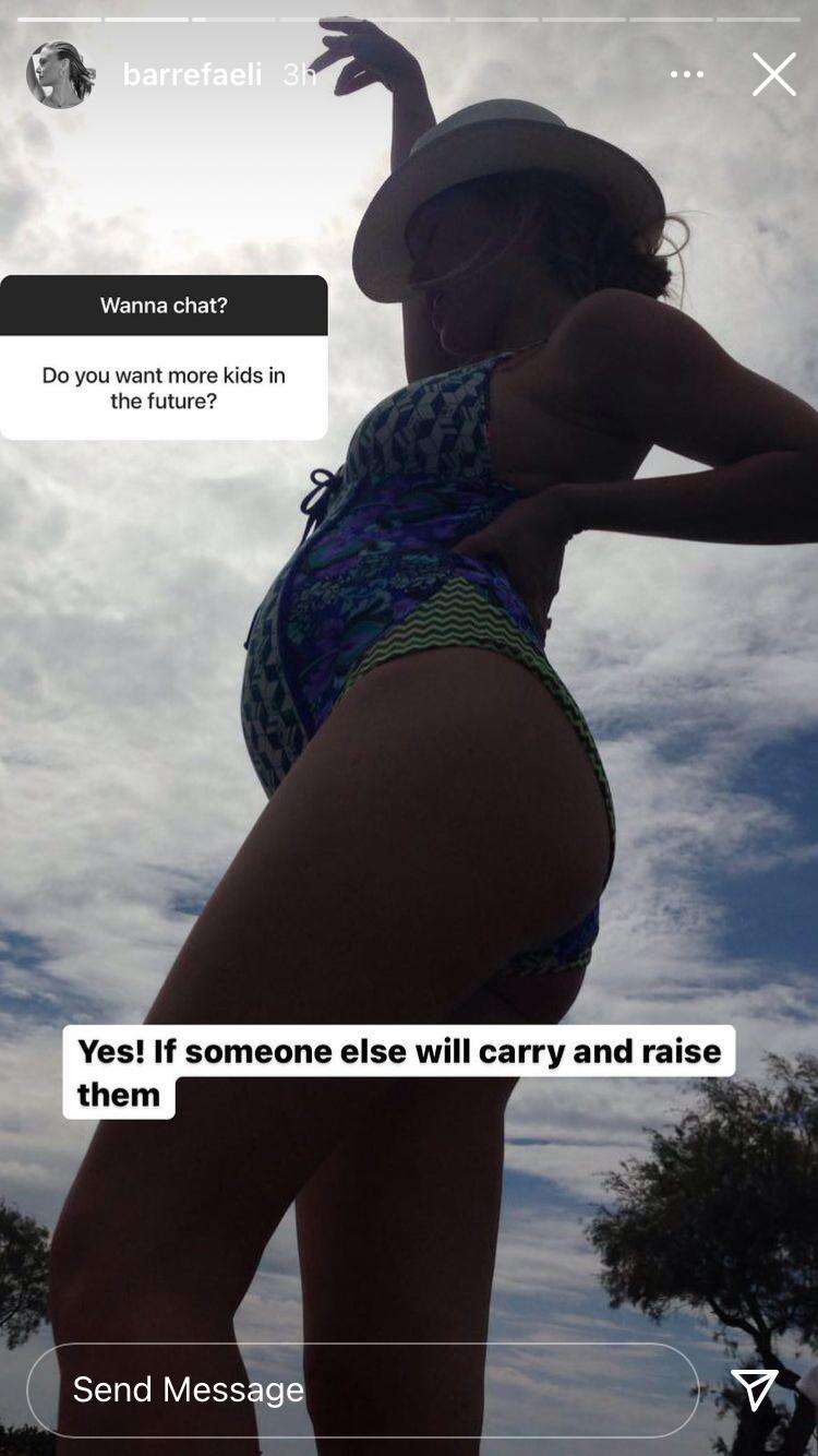 שאלה נוספת שנשאלה רפאלי התייחסה לעובדה שהיא אימא לשלושה ילדים קטנים, שהפרש הגילים ביניהם קטן. "איך זה להיות אימא לשלושה צפופים?" תהתה גולשת אחת. "תלוי באיזה יום את שואלת", השיבה בר. "הקטן עכשיו כמעט כבר בן שנתיים ומתחילים לראות את האור. כשהם מסתדרים, זו תחושת סיפוק והישגיות שאין שנייה לה", הכריזה.