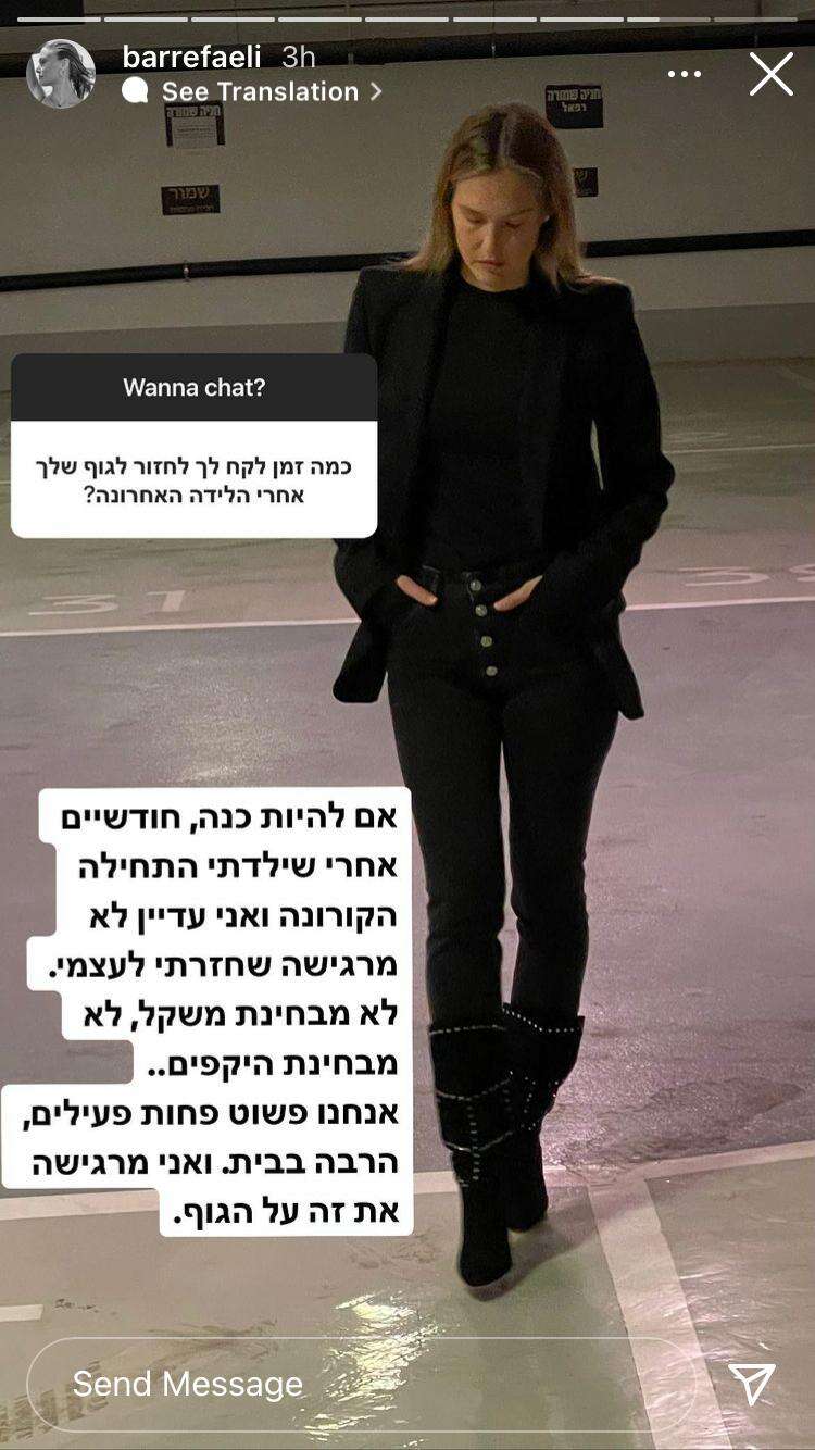 "כמה זמן לקח לך לחזור לגוף שלך אחרי הלידה האחרונה?", נשאלה רפאלי והשיבה בפתיחות "אם להיות כנה, חודשיים אחרי שילדתי התחילה הקורונה ואני עדיין לא מרגישה שחזרתי לעצמי. לא מבחינת משקל, ולא מבחינת היקפים. אנחנו פשוט פחות פעילים, הרבה בבית, ואני מרגישה את זה על הגוף", שיתפה.