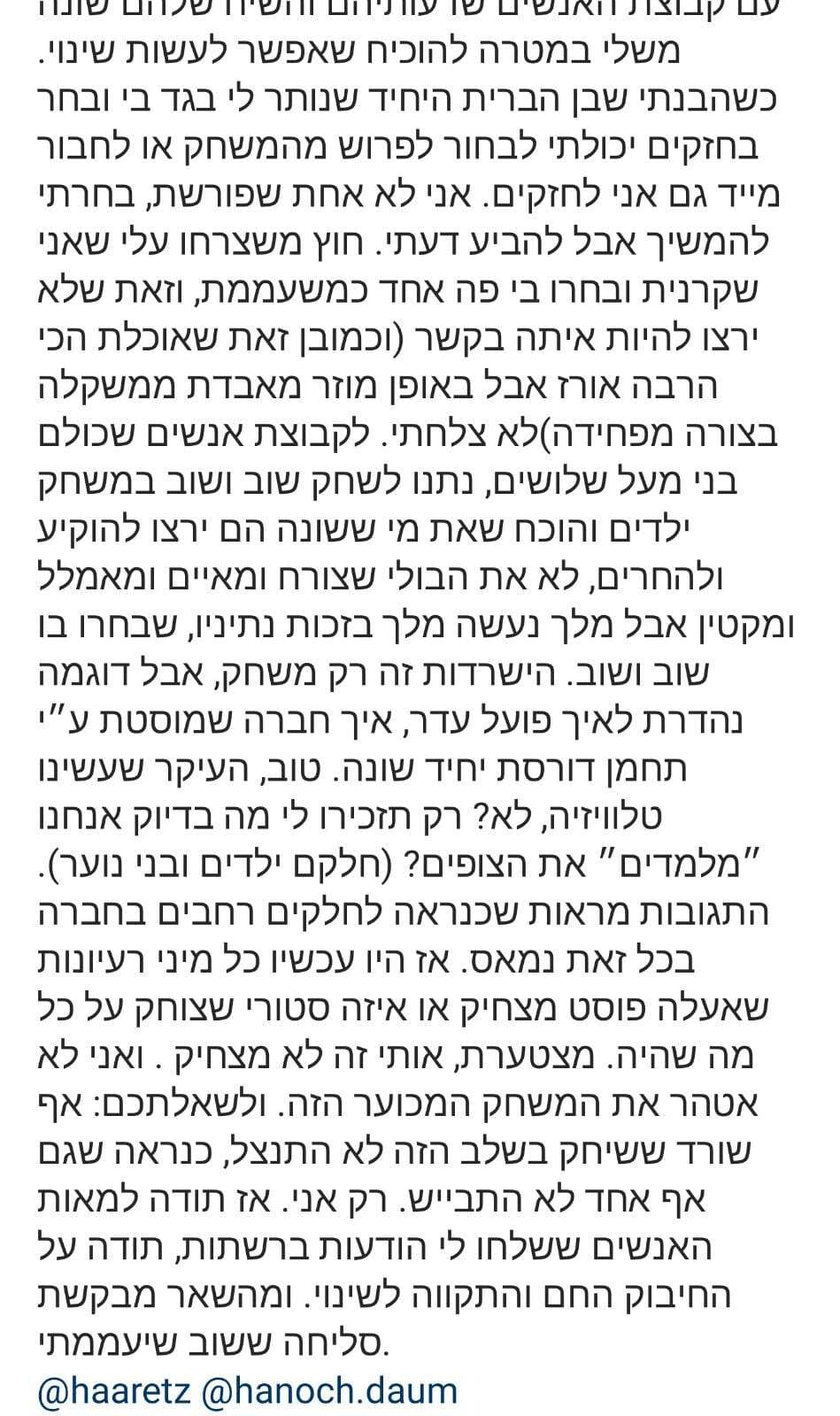 "טוב, העיקר שעשינו טלוויזיה, לא? רק תזכירו לי מה בדיוק אנחנו 'מלמדים' את הצופים? (חלקם ילדים ובני נוער)", ביקשה פרבר לדעת. "התגובות מראות שכנראה לחלקים רחבים בחברה בכל זאת נמאס, אז היו עכשיו כל מיני רעיונות שאעלה פוסט מצחיק או איזה סטורי שצוחק על כל מה שהיה", שיתפה בהצעות ובעצות שקיבלה לאחר השידור. "מצטערת, אותי זה לא מצחיק ואני לא אטהר את המשחק המכוער הזה. ולשאלתכם: אף שורד ששיחק בשלב הזה לא התנצל וכנראה שגם אף אחד לא התבייש. רק אני. אז תודה למאות האנשים ששלחו לי הודעות ברשתות, תודה על החיבוק החם והתקווה לשינוי. ומהשאר מבקשת סליחה ששוב שעממתי", חתמה את הפוסט, כשהיא מתייגת את עיתון הארץ ואת העיתונאי חנוך דאום שהעלה כזכור פוסט שיצא להגנתה בשבוע שעבר.