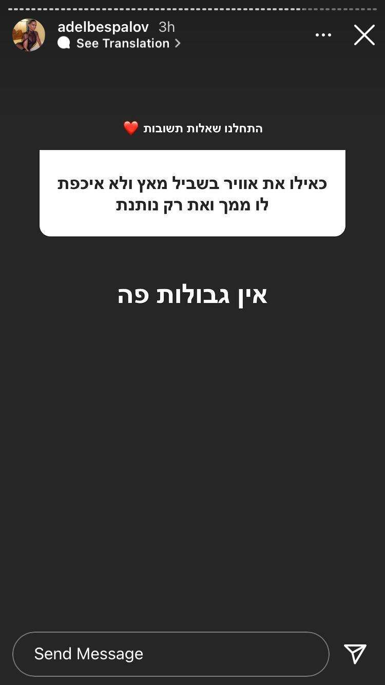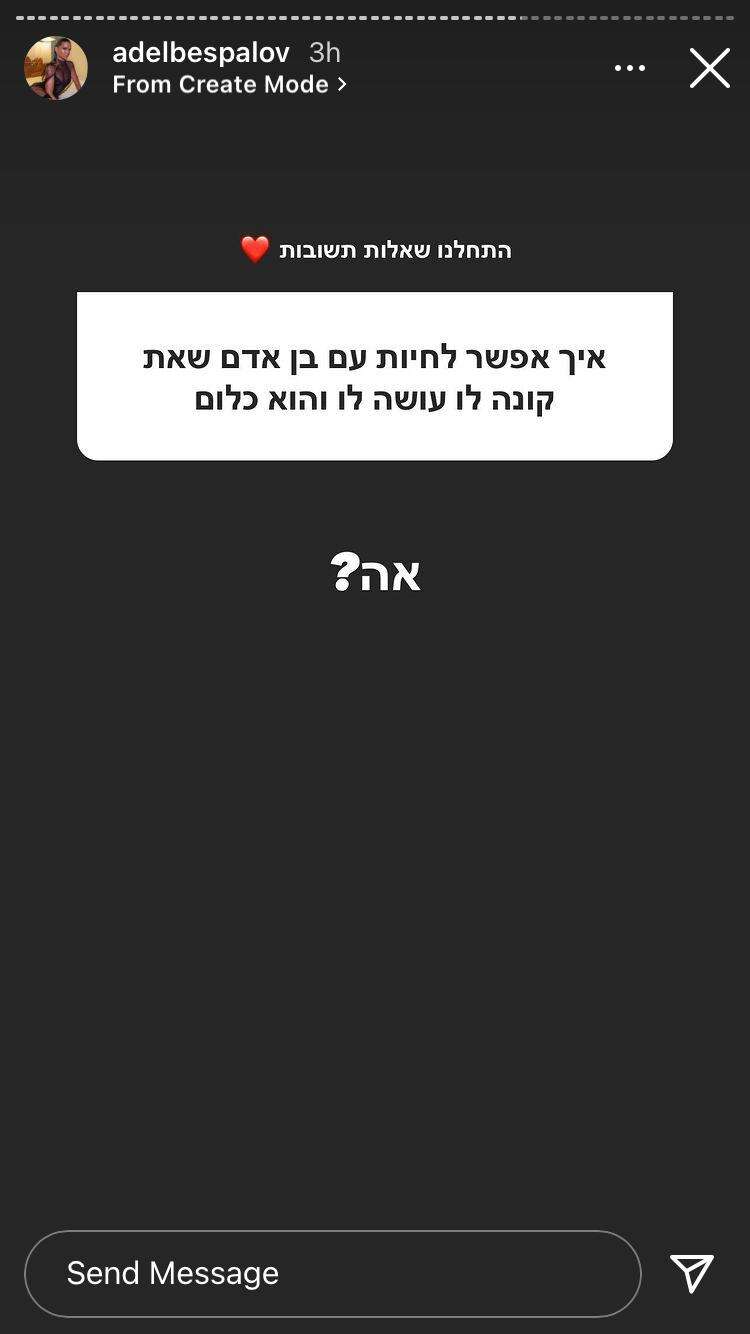 אחת העוקבות, שככל הנראה הבחינה בחקירה הלא נעימה שעברה אדל בסטורי, ביקשה להבין כיצד היא חשה לנוכח החיצים הרבים הנזרקים לכיוונה מצד הגולשים. "לא נמאס לך מהבנות פה שכותבות על מאץ' כאילו הן יודעות משהו על הזוגיות שלכם?", שאלה. "נמאס, אבל לצערי זאת המציאות של האינסטגרם שלי, וצריך להראות את האמת. אני החלטתי לשתף. זאת המציאות שלי ואני מראה לכם אותה!".