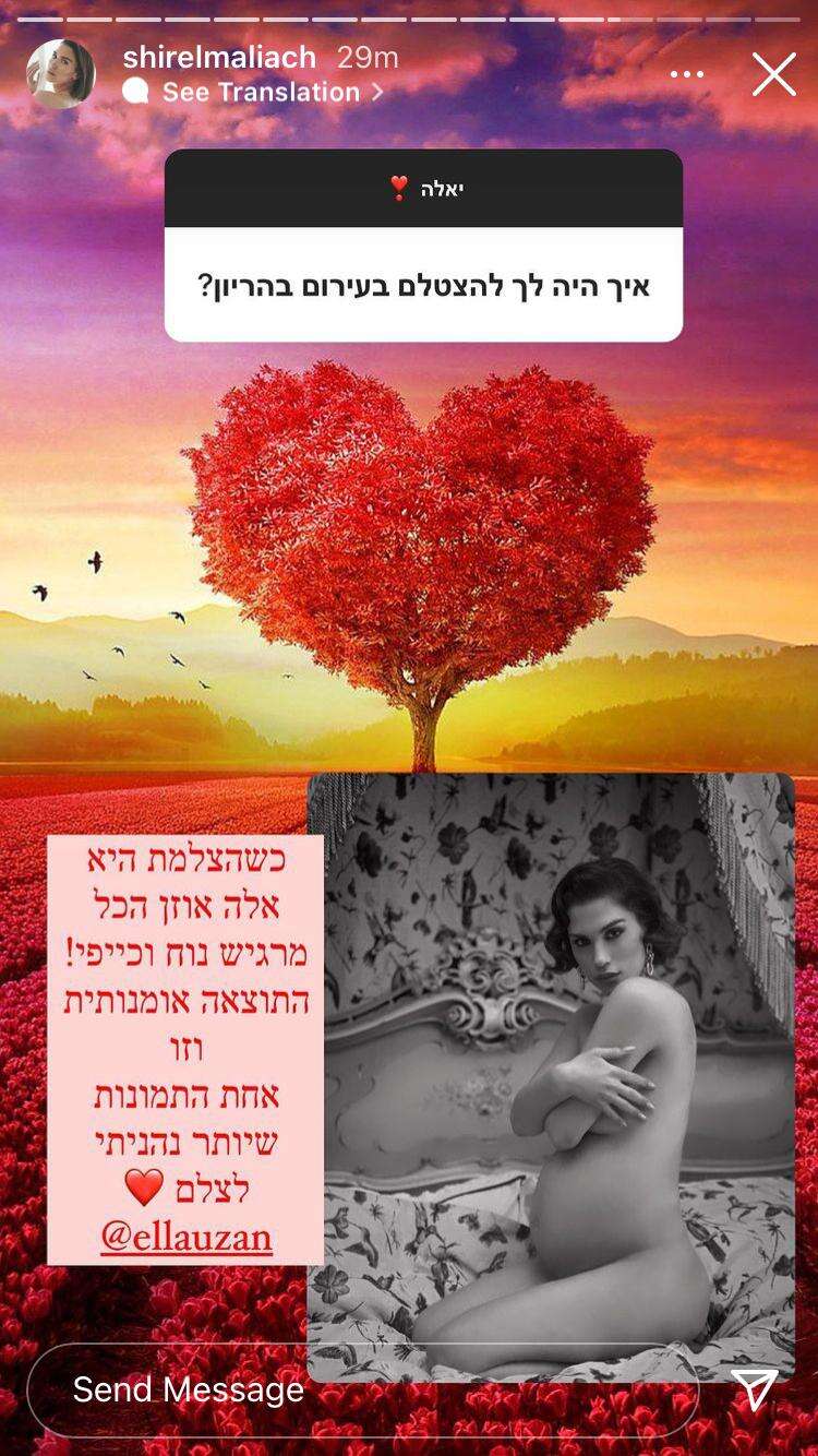 השאלה הראשונה שנשאלה אלמליח הייתה כאמור בנושא תמונת ההיריון בעירום שפורסמה באינסטגרם לפני כמה ימים וזכתה לסיקור תקשורתי רחב. "איך היה לך להצטלם בעירום בהיריון?" נשאלה. "כשהצלמת היא אלה אוזן, הכל מרגיש נוח וכיפי! התוצאה אמנותית, וזו אחת התמונות שיותר נהניתי לצלם", שיתפה.