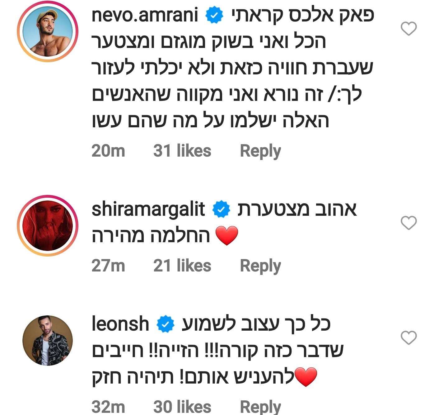 "אהוב, מצטערת. החלמה מהירה", הוסיפה הזמרת וכוכבת הרשת שירה מרגלית, ולאון שניידרובסקי הוסיף: "כל כך עצוב לשמוע שדבר כזה קורה. הזיה. חייבים להעניש אותם. תהיה חזק".
