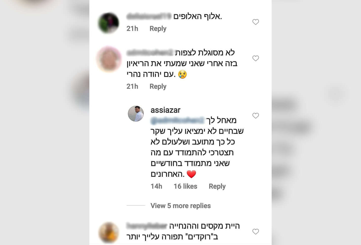 בראשון האחרון, נהרי פרסם פוסט זועם במיוחד על הראיון של חברתו הקרובה של עזר, רותם סלע, למהדורת סוף השבוע בו נשאלה, בין היתר, על ידי דנה ויס מה עמדתה בפרשה. "גברת רותם סלע, תתביישי לך", הטיח בה נהרי, "כי אני התביישתי עבורך", כתב. בתזמון כמעט מושלם, באותו הערב, אסי עזר החליף את לוסי איוב בהנחיית "רוקדים עם כוכבים" כשזו נאלצה להיעדר מהצילומים לאחר שאובחנה כחיובית לקורונה. עזר העלה פוסט ארוך לאינסטגרם שלו על חוויית הנחייה וזכה לתגובות מפרגנות.