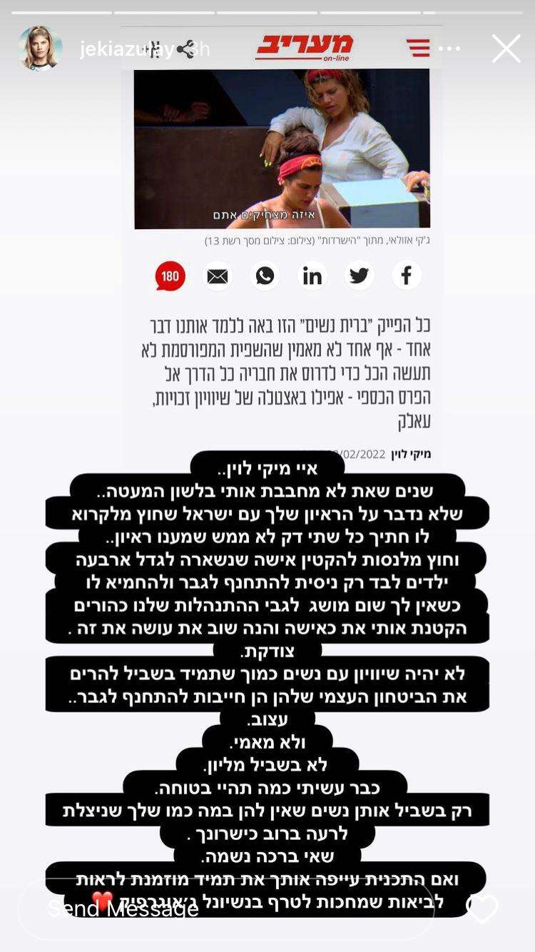 "איי מיקי לוין...", כתבה אזולאי בפתח דבריה, שהופיעו על רקע צילום מסך של טור הדעה במעריב שפורסם בעניינה. "שנים שאת לא מחבבת אותי בלשון המעטה", קבעה. "שלא נדבר על הראיון שלך עם ישראל (בעלה של אזולאי; י"ד), שחוץ מלקרוא לו 'חתיך' כל שתי דקות, לא ממש שמענו ראיון", מחאה. "וחוץ מלנסות להקטין אישה שנשארה לגדל ארבעה ילדים לבד, רק ניסית להתחנף לגבר ולהחמיא לו, כשאין לך שום מושג לגבי ההתנהלות שלנו כהורים. הקטנת אותי. את, כאישה. והנה שוב את עושה את זה. צודקת. לא יהיה שוויון עם נשים כמוך, שתמיד בשביל להרים את הביטחון העצמי שלהן, הן חייבות להתחנף לגבר", האשימה. "עצוב. ולא, מאמי, לא בשביל מיליון. כבר עשיתי כמה, תהיי בטוחה", השיבה באופן ישיר לטענות שבכותרת הטור. "זה רק בשביל אותן נשים שאין להן במה כמו שלך, שניצלת לרעה ברוב כישרונך. שאי ברכה, נשמה. ואם התכנית עייפה אותך", שבה והתייחסה לדברים שנכתבו על ידי לוין, "את תמיד מוזמנת לראות לביאות שמחכות לטרף בנשיונל ג'אוגרפיק".