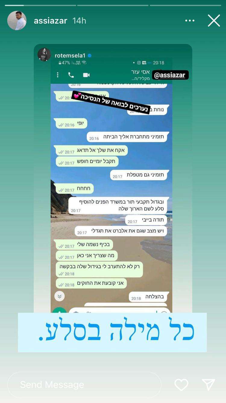 שעות קודם לכן, העלה עזר לרשת גם שיחת וואטסאפ שקיים עם חברתו ושותפתו להנחיה, רותם סלע, שכתבה בכותרת לצילום המסך "נערכים לבואה של הנסיכה". "תקבל יומיים חופש", כתבה לו סלע במהלך השיחה הכתובה. "תזמיני גם מטפלת", דרש אסי, שנענה בצחוק. "ובגדול, תקבעי תור במשרד הפנים להוסיף 'סלע' לשם הארוך שלה (הכוונה היא לשמה של בתו אלכס אשלי; י"ד). תודה, בייבי. ויש מצב שגם את אלברט את תגדלי", עקץ. "בכיף, נשמה שלי. מה שצריך אני כאן. רק לא להתערב לי בגידול שלה, בבקשה. אני קובעת את החוקים", דרשה ופסקה. "בהצלחה", השיב לה עזר והוסיף לאחר מכן את משחק המילים "כל מילה בסלע".