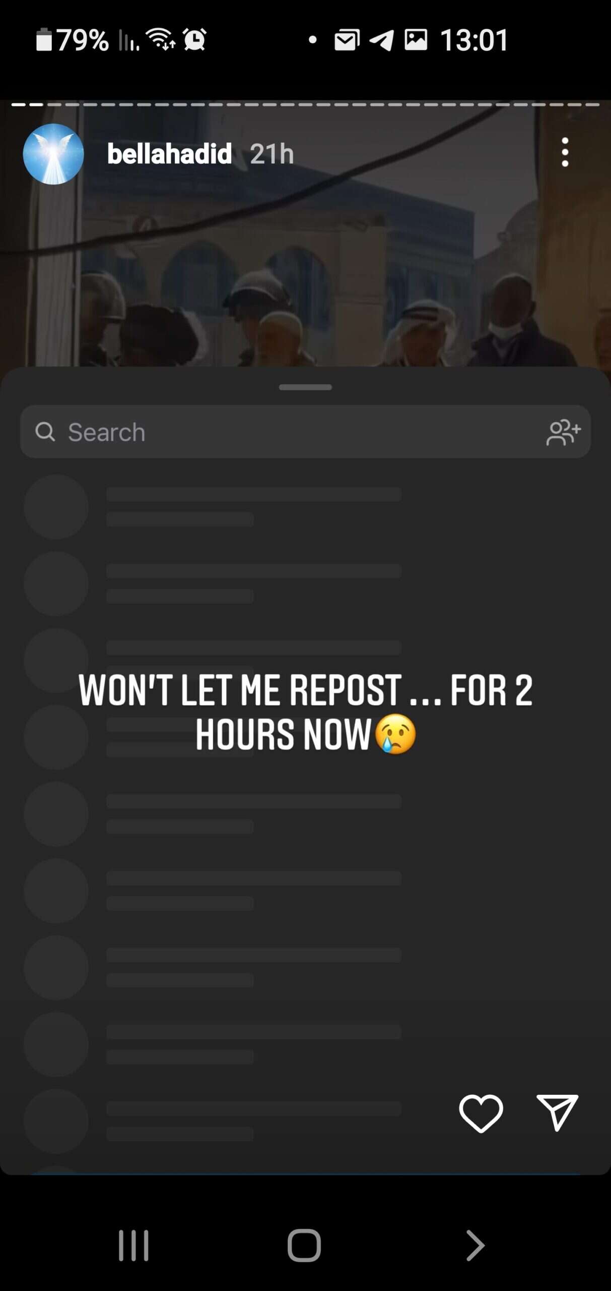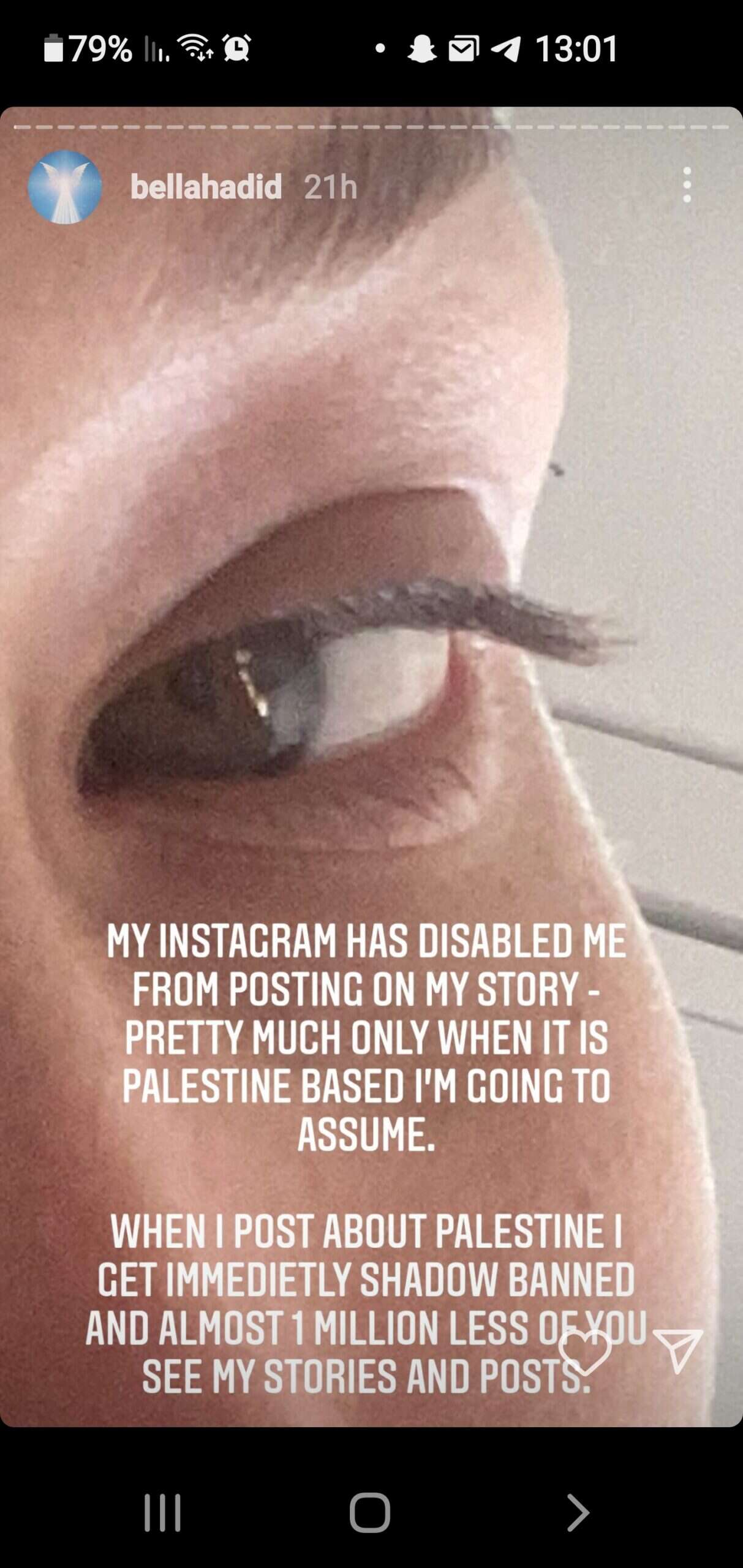 חדיד (25), שלה 51 מיליון עוקבים באינסטגרם, עדכנה את עוקביה בסדרת סטוריז שהעלתה ביום שישי, כי אינסטגרם מעכבת או לא מאפשרת לה להעלות בכלל סטוריז שהיא מזהה בהם תוכן התומך בפלשתין ויוצא נגד ישראל. "האינסטגרם שלי ניטרל לי את האפשרות להעלות סטוריז אבל רק כאלה הקשורים לפלשתין", כתבה לעוקביה, כשהיא מוסיפה תמונה שלה בוכייה.
