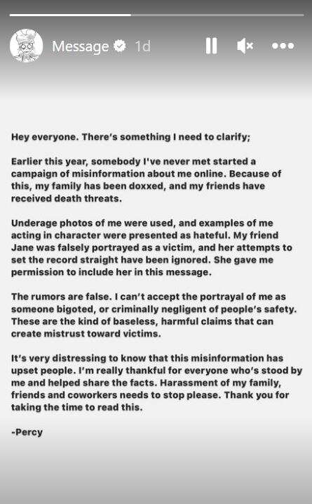 הדיווחים היו קשים וגרפיים והתבססו על ציוץ שהעלתה גולשת בטוויטר בשם Milkievich, אליו צירפה את ההאשטאג CancelPercy ("לבטל את פרסי" מאנגלית, ע"ח), שבו הפנתה אצבע מאשימה כלפי השחקן וחבריו, בטענה שהטרידו מינית נערות צעירות (חלקן קטינות) במסיבות ובאירועים חברתיים בהם השתתפו.