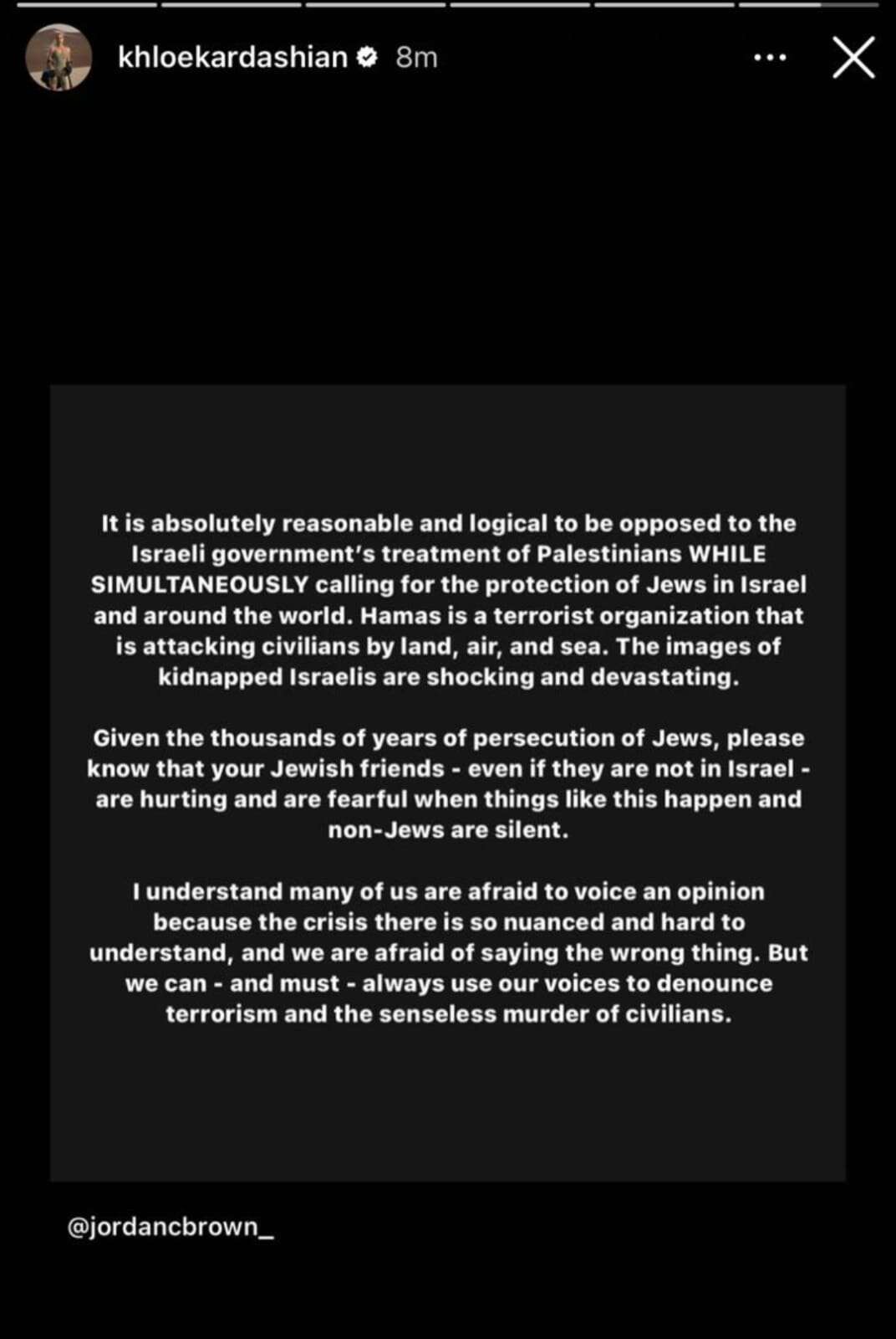 אחרי שאחותה קיילי מחקה את סטורי התמיכה שלה בישראל, קלואי קרדשיאן שיתפה פוסט שמתייחס למצב: "בהחלט הגיוני וסביר להתנגד לצורה שבה מתייחסת ממשלת ישראל לפלשתינים, ובאותה עת לקרוא להגנת יהודי ישראל והעולם. חמאס הוא ארגון טרור שתוקף אזרחים דרך היבשה, האוויר והים. התמונות של יהודים שנופלים בשבי מעוררות הלם וזעזוע.