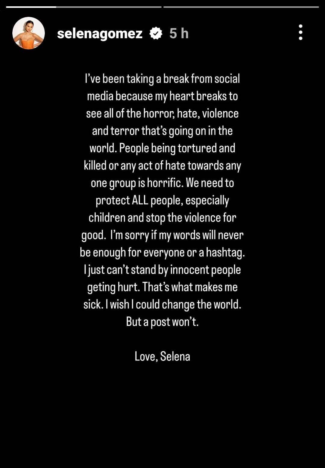 "לקחתי הפסקה מהמדיה החברתית בגלל שהלב שלי נשבר מלראות את הזוועה, השנאה, האלימות והטרור המתרחשים בעולם", כתבה בסטורי אותו שיתפה עם 430 מיליון עוקביה.