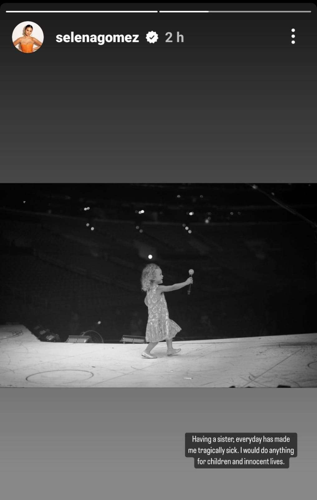 שעות לאחר פרסום הסטורי הזה, גומז הוסיפה סטורי קצר נוסף בו כתבה: "כמי שיש לה אחות (לגומז יש שתי אחיות למחצה), כל יום גורם לי להיות חולה מהטרגדיות. אני אעשה הכל למען ילדים וחייהם של חפים מפשע".