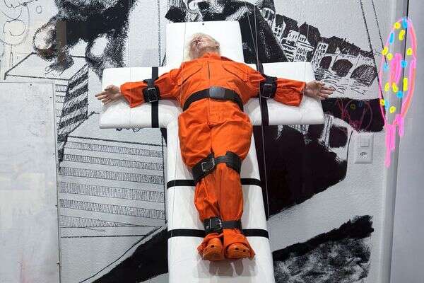 הפסל, שגובהו 1.47 מטר, מציג את טראמפ לבוש בסרבל כלא כתום ונעלי קרוקס, ראשו מופנה לצד ועיניו עצומות. האלונקה מזכירה את מיטות ההוצאה להורג בארצות הברית, בעוד צורתה הצלבית מזמינה את הצופים להחליט אם הסצנה מתארת צליבה או הזרקת רעל. "המיצב תוכנן כך שניתן יהיה לצפות בו אנכית כמו צליבה או אופקית כמו הוצאה להורג", ציין העיתון "מירור".