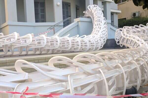 הכיסאות המזוהים עם פרצי אלימות ספונטנית שהופכים בתורם לסרטונים ויראליים מוצגים כדרקון או נחש מפלצתי ברוח עידן הטרללת הנוכחי. נחש הכיסאות הזה, שמורכב מכ-300 כיסאות לבנים, הוא חלק מתערוכת עיצוב ואמנות שתפתח מחר (שישי) במרכז אדמונד דה רוטשילד.