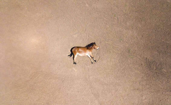 סוס שוכב על האדמה. צילום רחפן. סמוך ליער חדרה, 1 ביולי 2019.