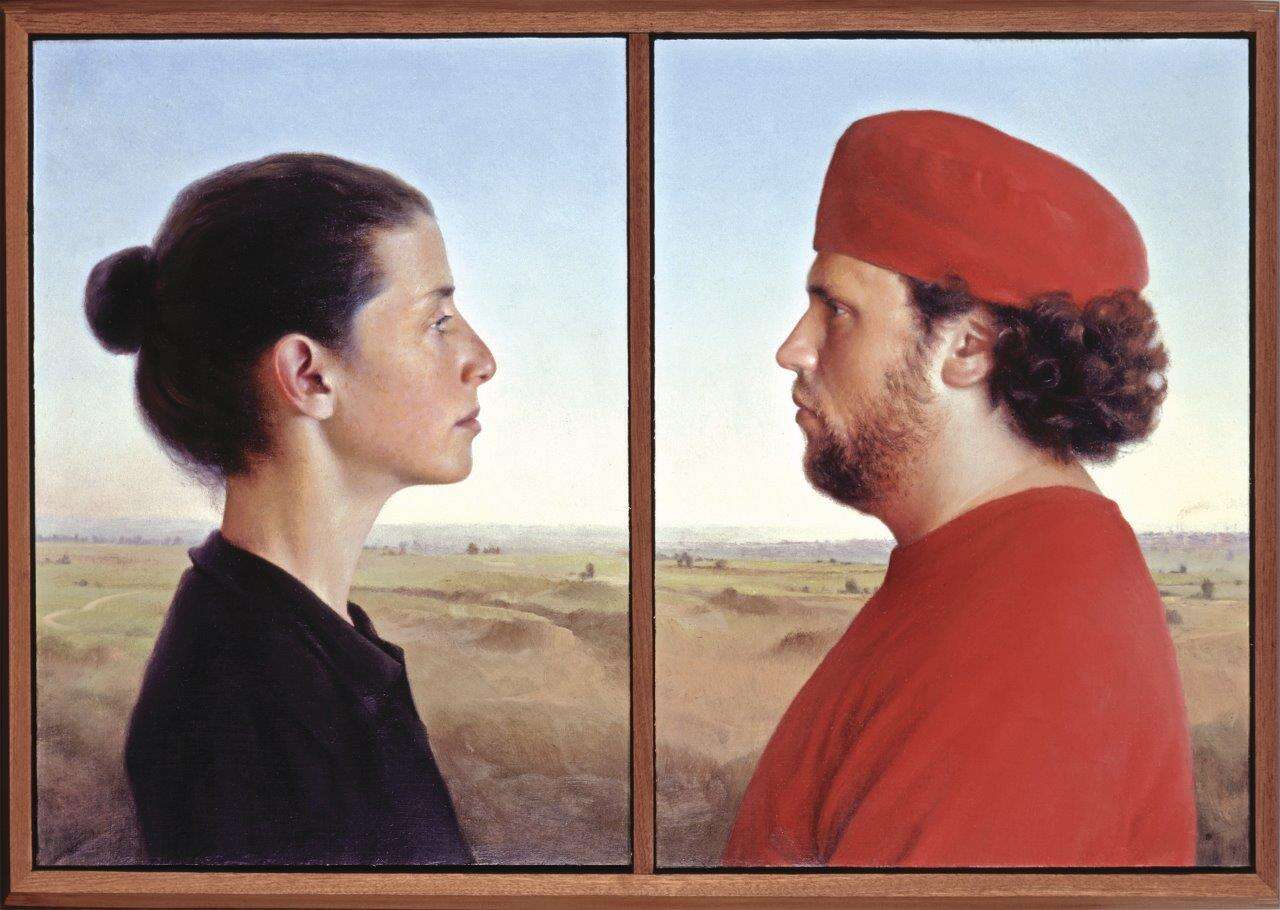 התערוכה נפתחת בקיר דיוקנאות עצמיים, חלקם רומזים אל מסורת הצייר המצייר (גם בהמשך המסע נראה זאת), והיא נחתמת בקיר ציורי טבע דומם של האמנים. בעבודות ניכרת ההתעקשות על אנטומיה, הידע האקדמי על צבעוניות, ההתבוננות הסיזיפית הסבלנית במודל, באובייקט, באור ובצל, בטקסטורה. אנו מתוודעים לאותם מוטיבים "אנטי־מודרניסטיים": פָּלֵטָה (פְּתֵכָה בעברית), קו, מרחב, אור, קומפוזיציה.