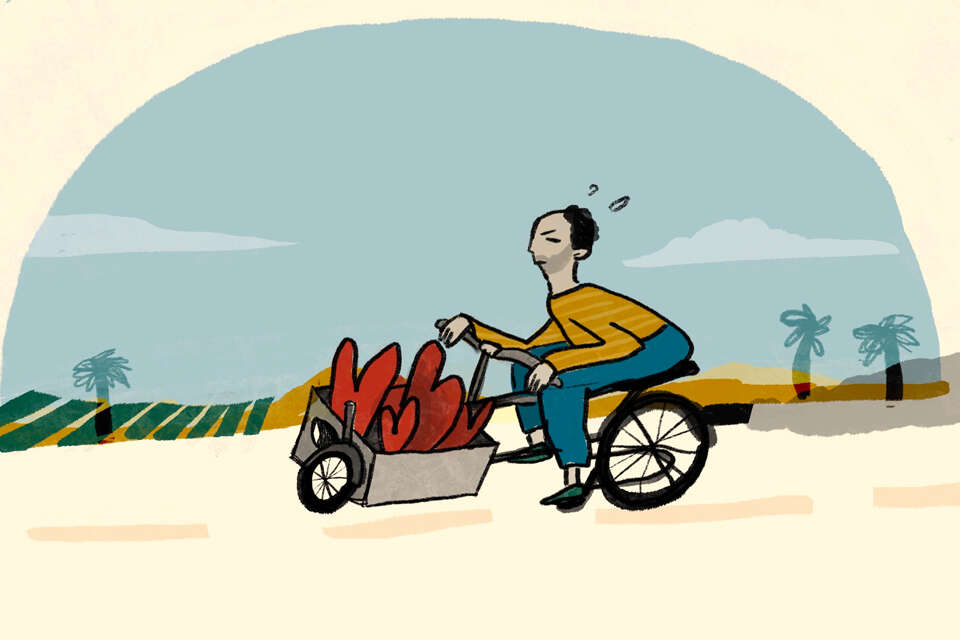 הוא לא חיפש טרמפ, כי לא רצה למנוע מעצמו אפילו קילומטר רכיבה אחד. הוא רכב בהתמדה, קילומטר אחר קילומטר. שדות הנגב המערבי התחלפו בנופי מולדתו. הוא ראה לנגד עיניו את הכפר שבו נולד, את הדרך הארוכה מהכפר אל העיר הסמוכה, מנוקדת במוסכים ובמזללות, בתי קפה ובתי עסק. בימי חג משפחות שלמות היו יוצאות למסעדות, סבתות ונכדים, ילדות וילדים קטנים בבגדים חגיגיים, אוכלים פיצות ופירות ים ברוטב מתקתק וגלידות רוויות סוכר. גם בשתיים ובשלוש לפנות בוקר המה הרחוב בני אדם, המוסכים פעלו כמו גם חנויות לממכר סיטונאי של קמח ושמן, ובתוך עשן הדיזל של הטנדרים והלכלוך שהצטבר סביב השיחים המאובקים התרוצצו ילדים שמחים. הוא זכר את אושרו כילד האוחז בידיים דביקות מנת גלידה ענקית, ולה רוטב אדום זוהר. הוא נזכר בהוריו, באביו שעבד לפרקים במפעל לייצור פחיות, ובאמו שאותה ראה רק פעם בשנה, כשהגיעה לחופשה מעבודתה כמטפלת בזוג קשישים בסינגפור. הוא נזכר כיצד עזב את כפרו כדי לעבוד בארץ זרה ורחוקה כאח סיעודי ובהמשך כמנקה בתים, כי כך הרוויח יותר כסף.