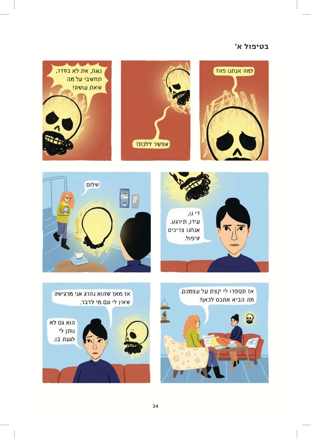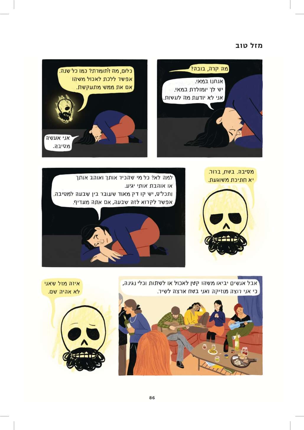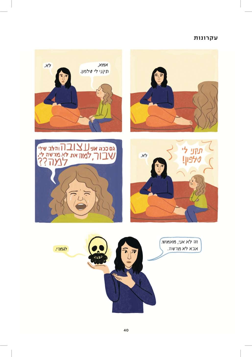 היו לי הרבה שאלות לשאול את עידו, ולא היה לי אותו. אז ציירתי גולגולת מזוקנת והתחלתי לכתוב איתה דיאלוגים. בריבועים האלה מצאתי דרך לכתוב את ההחמצה הבלתי נמנעת גם מכל הדברים שלא הספקנו ולא יהיו, אבל גם את תחושת ההחמצה על שיחות שלא היו יכולות להתקיים איתו ולא היו, כי אלו שאלות שמביאות בחשבון את העובדה שהוא מת.